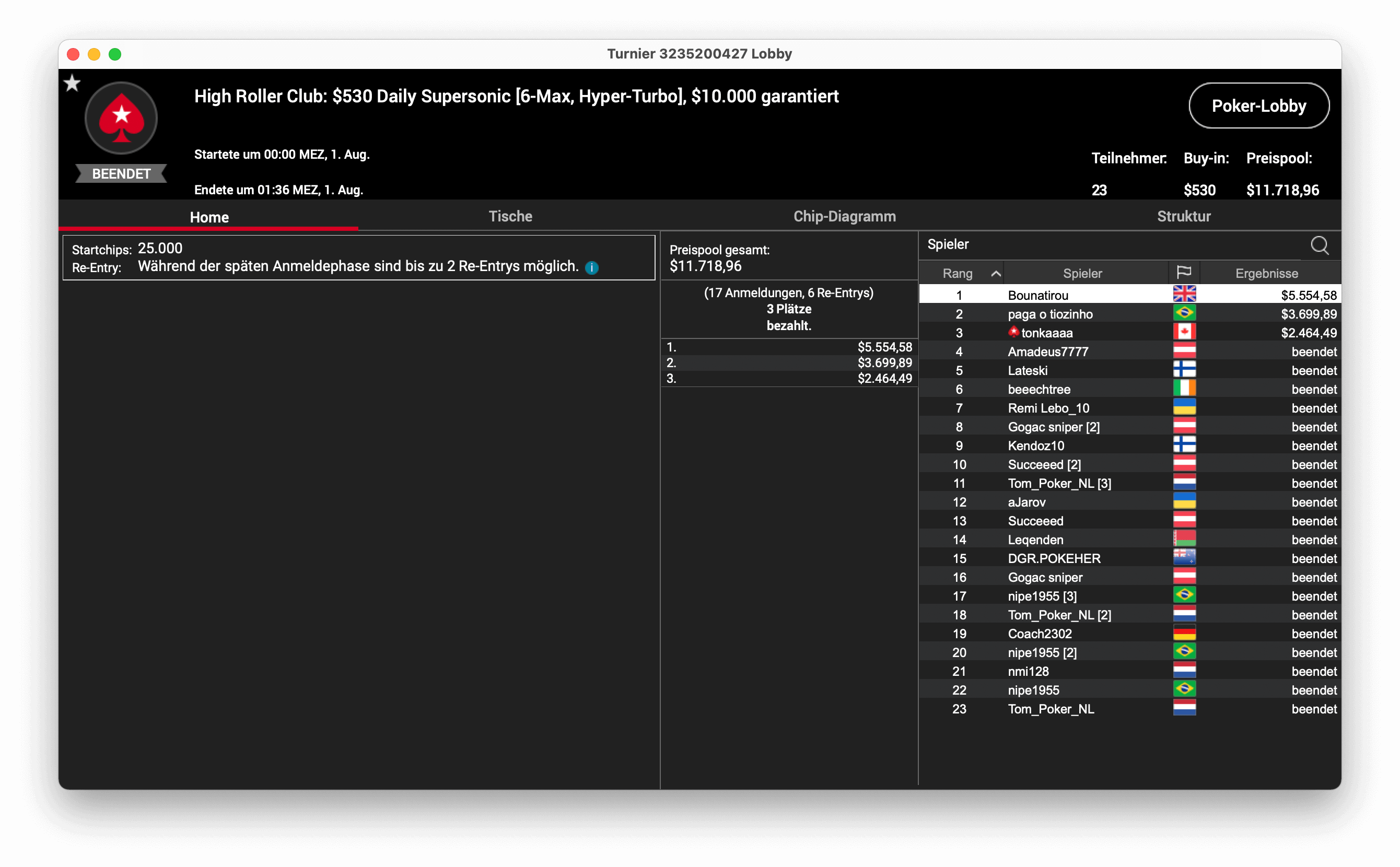 Dominik „Bounatirou“ Nitsche schnappte sich das $530 Daily Supersonic und ließ 22 gegnerische Entries hinter sich. Der Sieg brachte $5.554. Parker „tonkaaaa“ Talbot wurde Dritter, „Amadeus7777“ Vierter.