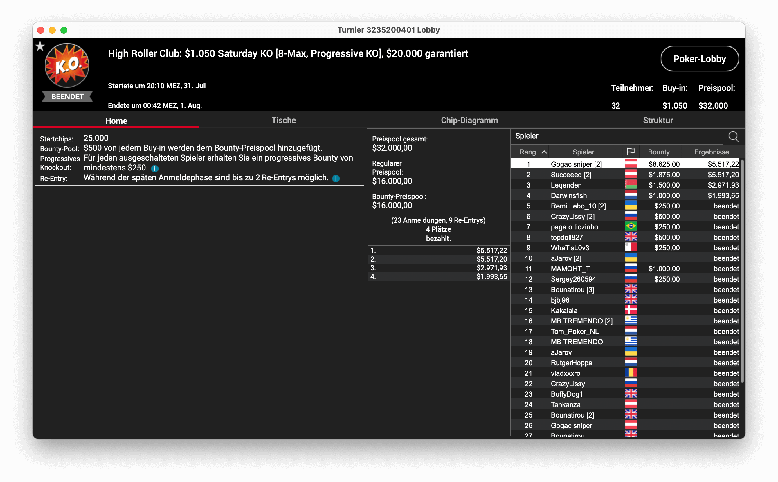 Österreicher „Gogac sniper“ besiegte Jakob „Succeeed“ im Heads-Up des $1.050 Saturday KO. 32 Entries sorgten hier für einen $32.000 Preispool. Der Sieg wurde mit $8.625 + $5.517 belohnt. Der Weißrusse Ilya „Leqenden“ Anatsky wurde Dritter.