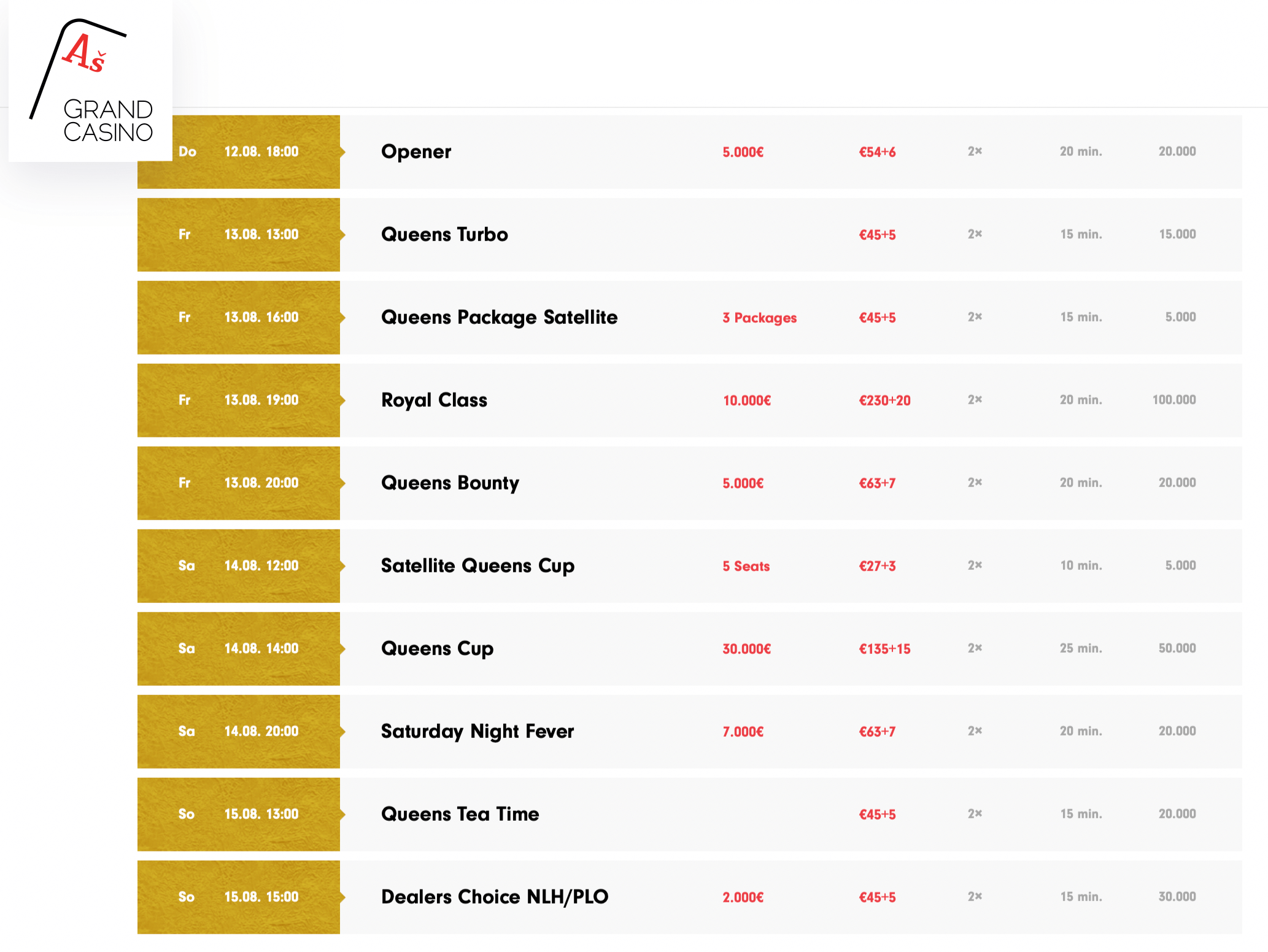 Los geht es am Donnerstag um 18:00 Uhr mit dem Opener für €54+6 mit €6.000 Garantie. Das Queens Turbo läutet dann den Freitag um 13:00 Uhr für €45+5 ein.