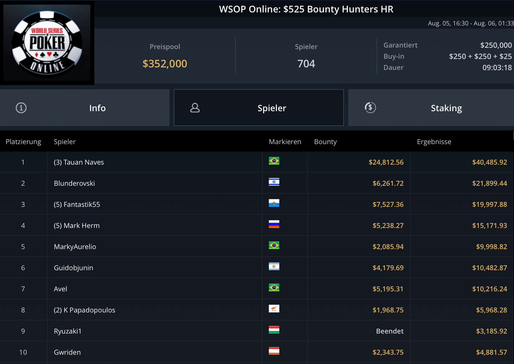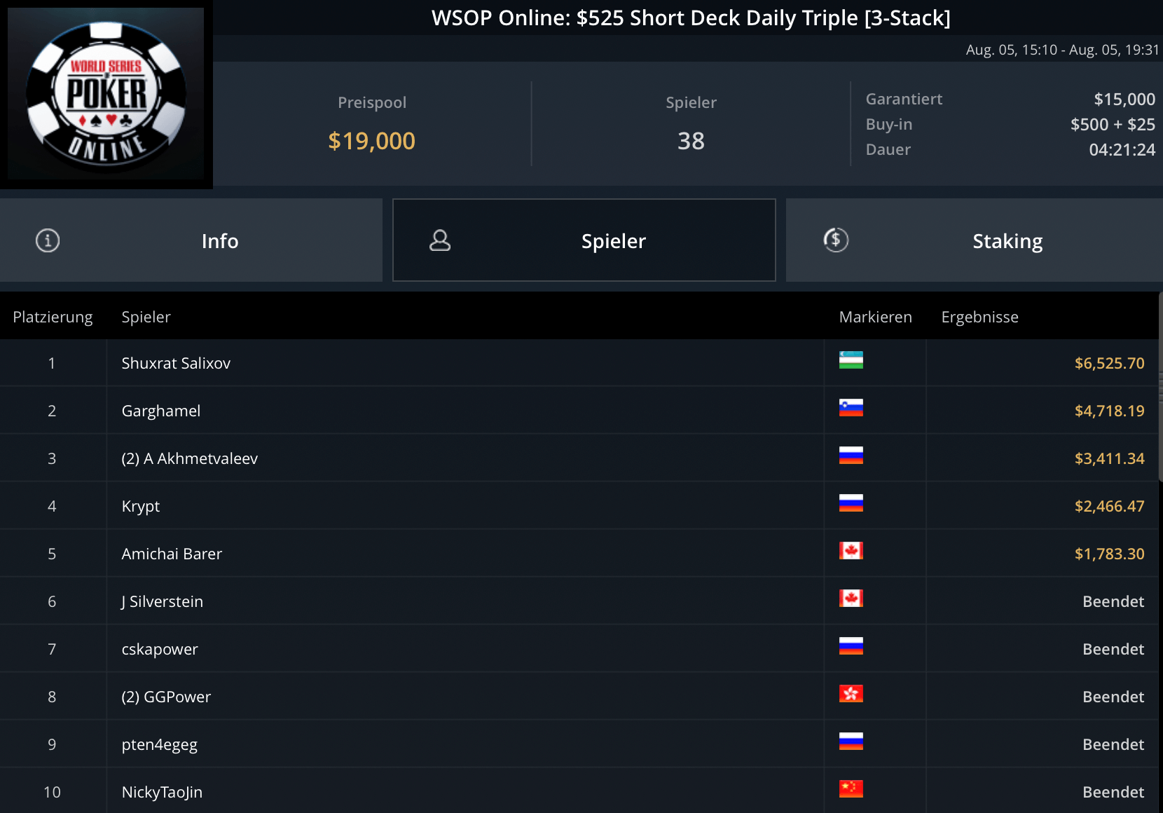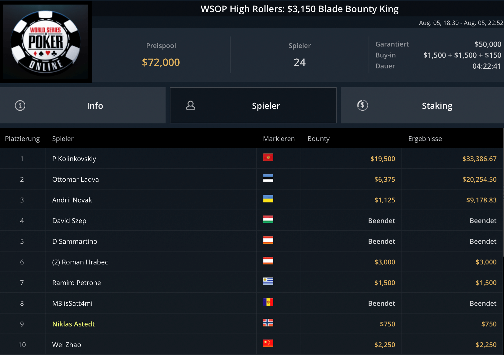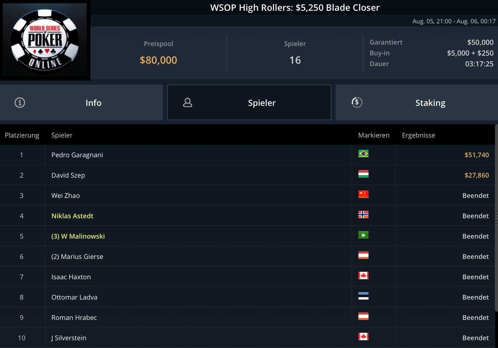 Das teurste Turnier des Tages, das $5.250 Blade Closer ging an Pedro Garagnani für $51.740. David Szep wurde Runner-Up für $27.860. Niklas Astedt, Wiktor Malinowski (3x Bullets), Marius Gierse (2x Bullets) und Ike Haxton gingen in dem Turnier mit $80.000 Preispool leer aus.