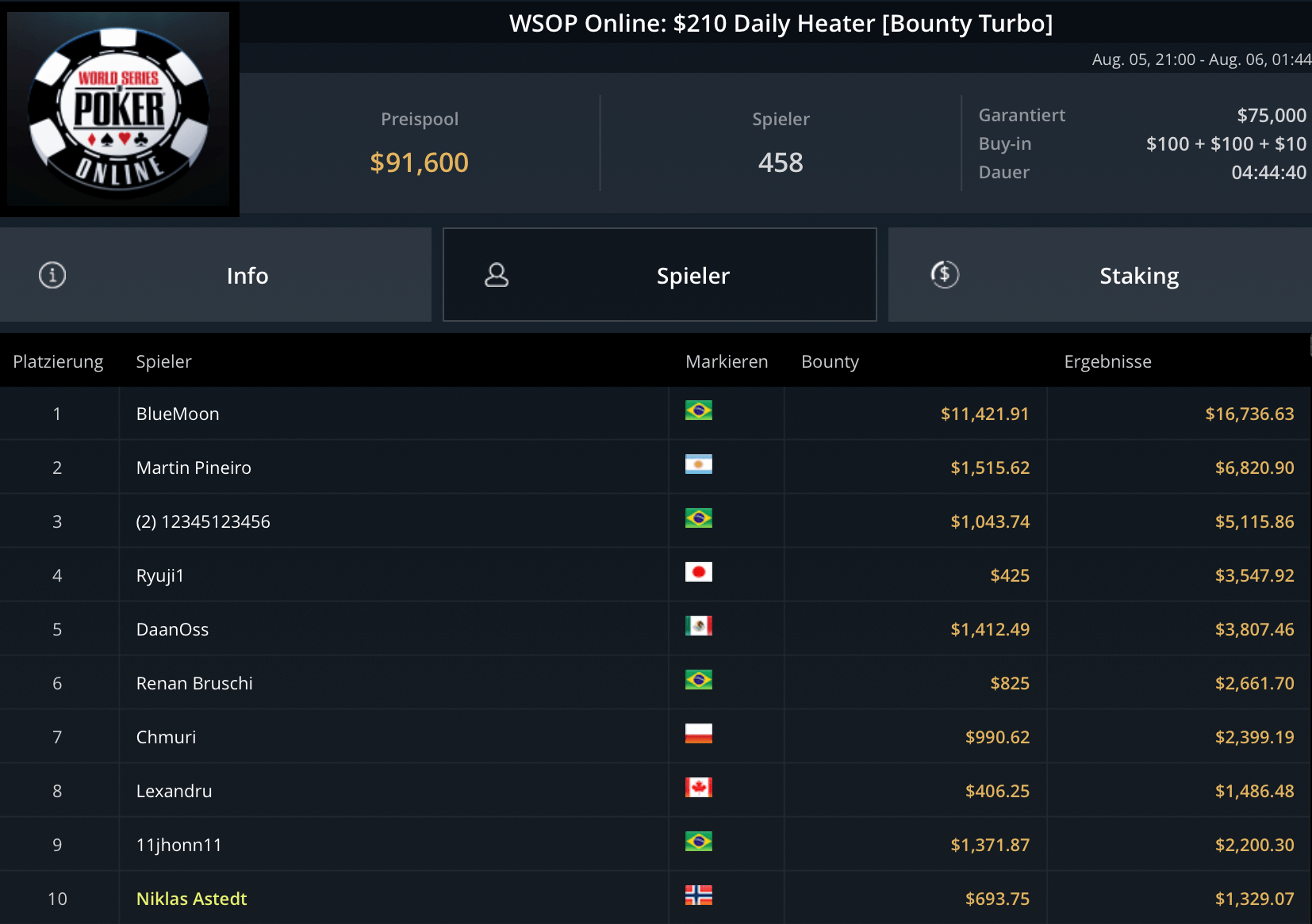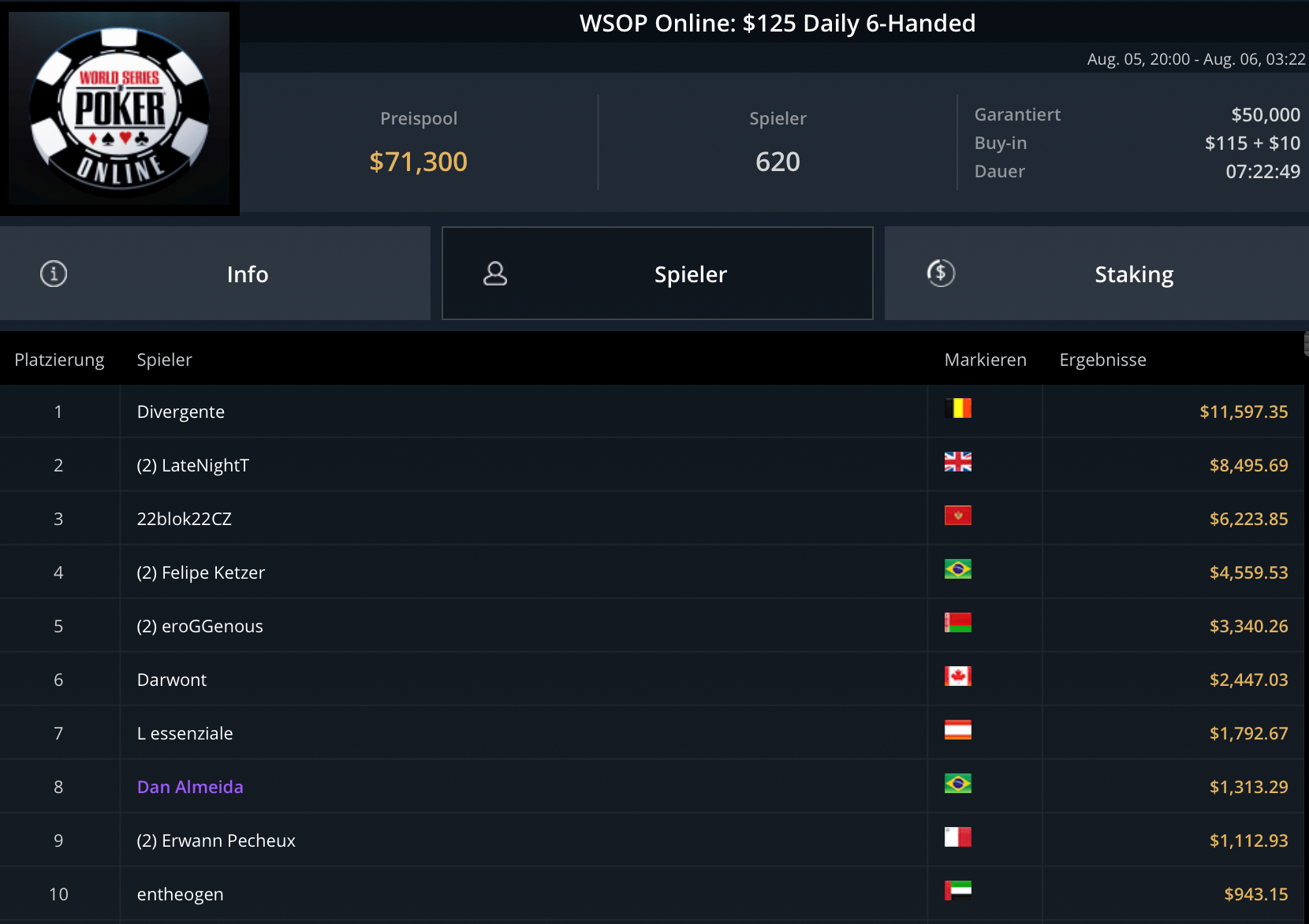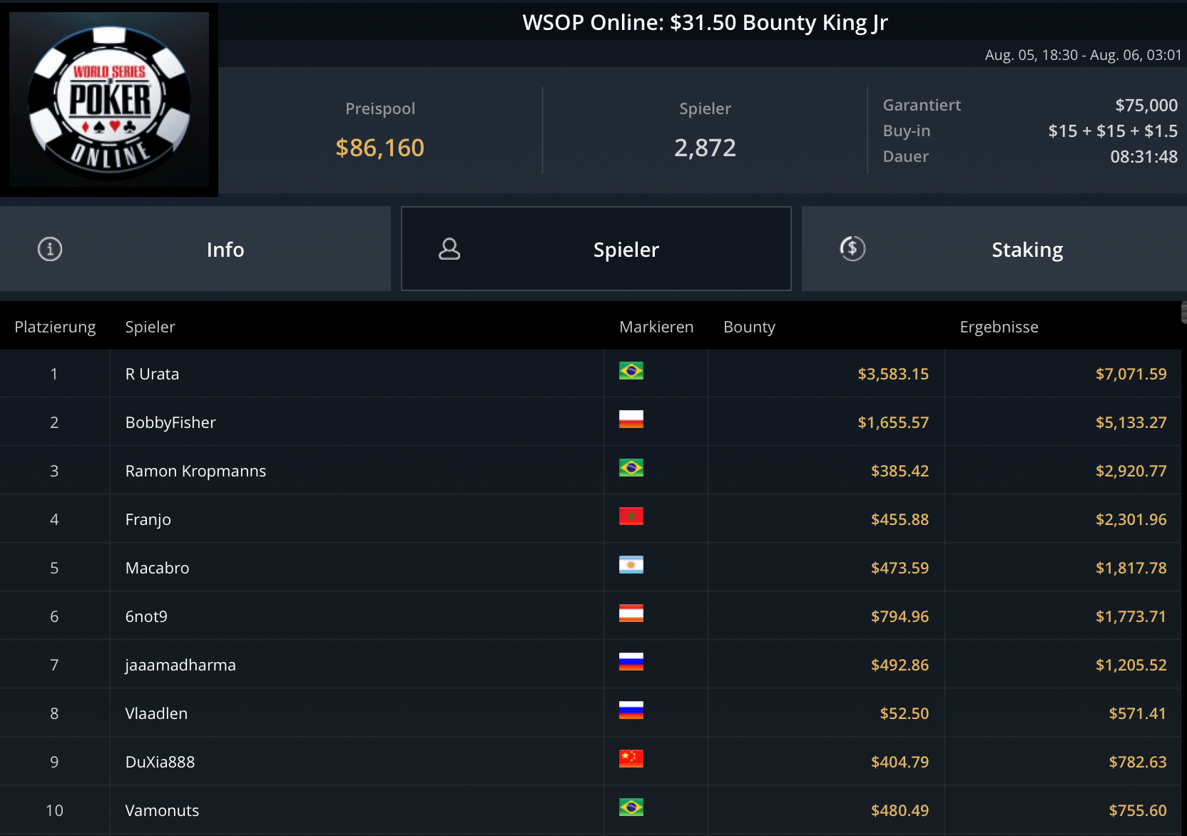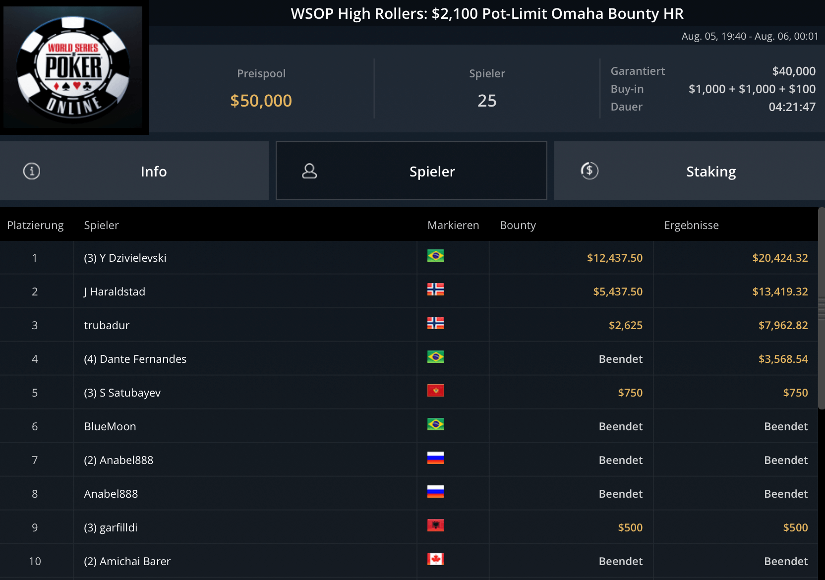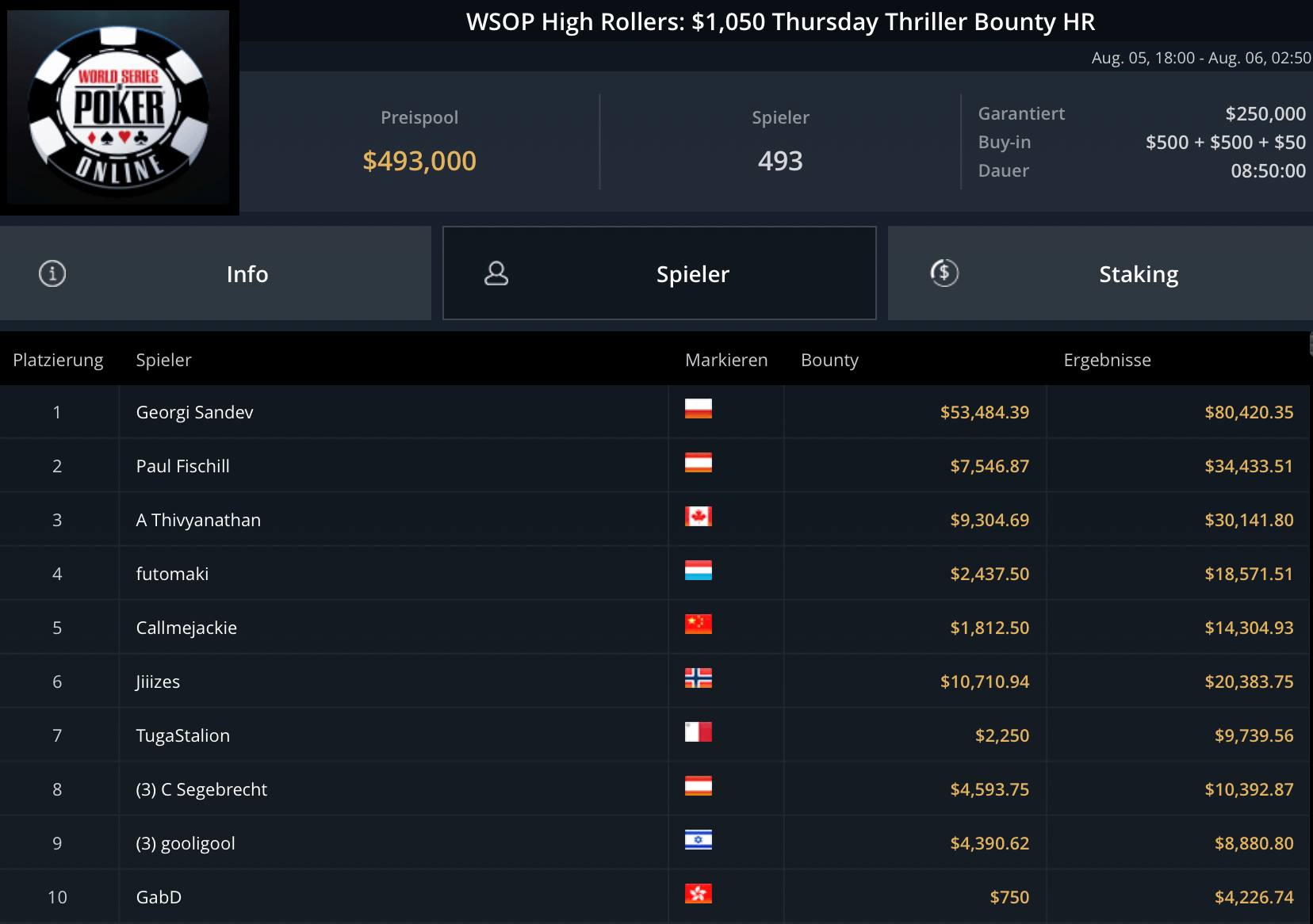 Das teurste Turnier des Tages, das $5.250 Blade Closer ging an Pedro Garagnani für $51.740. David Szep wurde Runner-Up für $27.860. Niklas Astedt, Wiktor Malinowski (3x Bullets), Marius Gierse (2x Bullets) und Ike Haxton gingen in dem Turnier mit $80.000 Preispool leer aus.