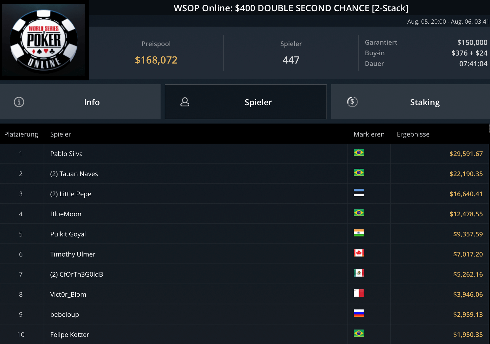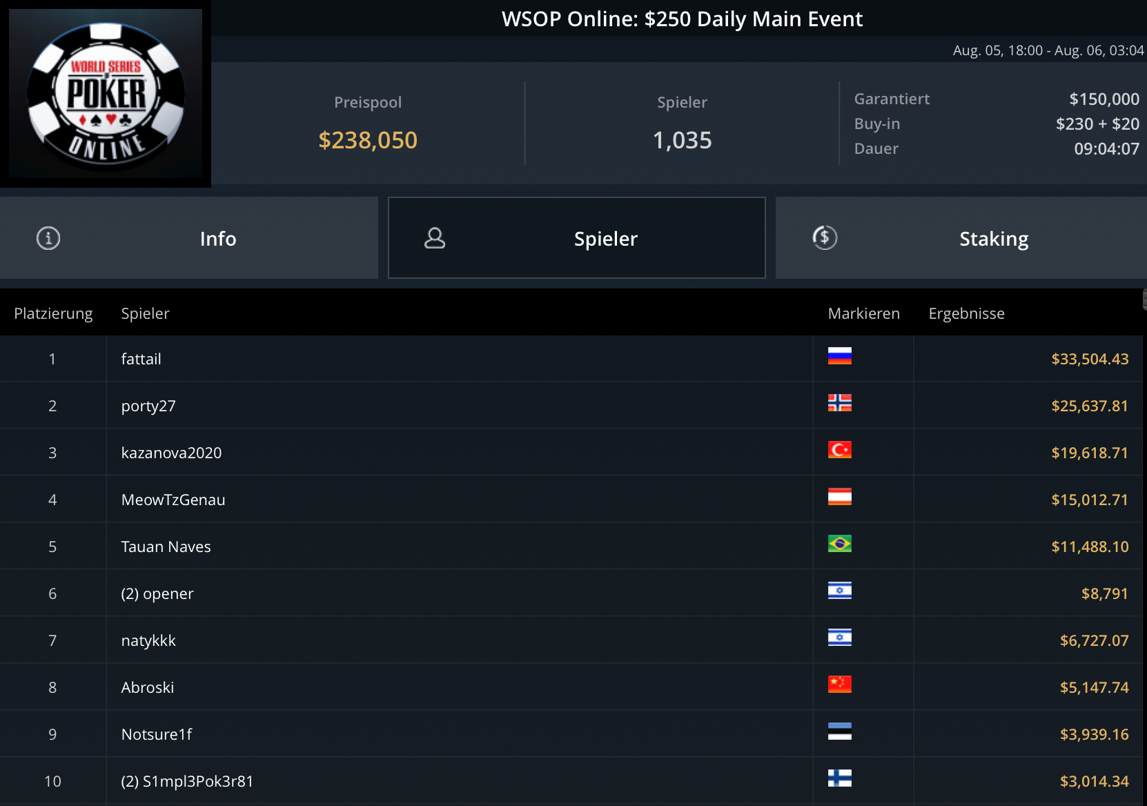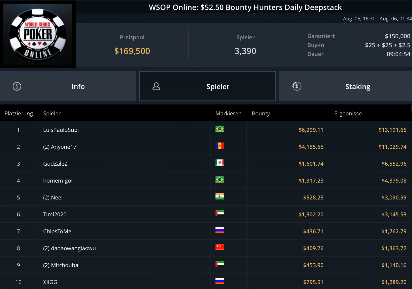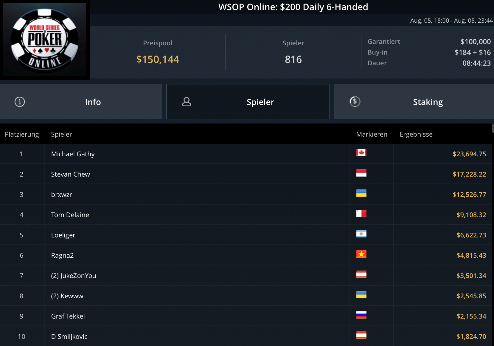 Das teurste Turnier des Tages, das $5.250 Blade Closer ging an Pedro Garagnani für $51.740. David Szep wurde Runner-Up für $27.860. Niklas Astedt, Wiktor Malinowski (3x Bullets), Marius Gierse (2x Bullets) und Ike Haxton gingen in dem Turnier mit $80.000 Preispool leer aus.