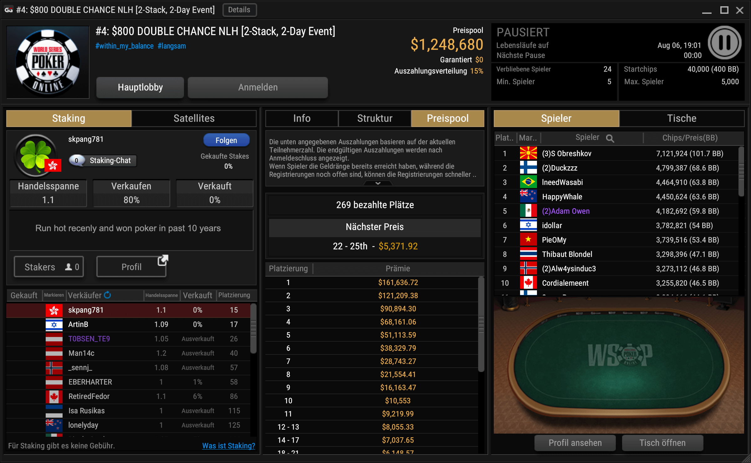 In Event #04, dem $800 Double Chance, kam ein $1.248.680 Preispool zustande. Von den 1.642 Startern sind noch 24 Spieler übrig. Der Bulgare unter mazedonischer Flagge Stoyan Obreshkov ist mit 101 BB der Chipleader. Zweitplatzierter „Duckzzz“ ist mit 68 BB recht weit abgeschlagen.