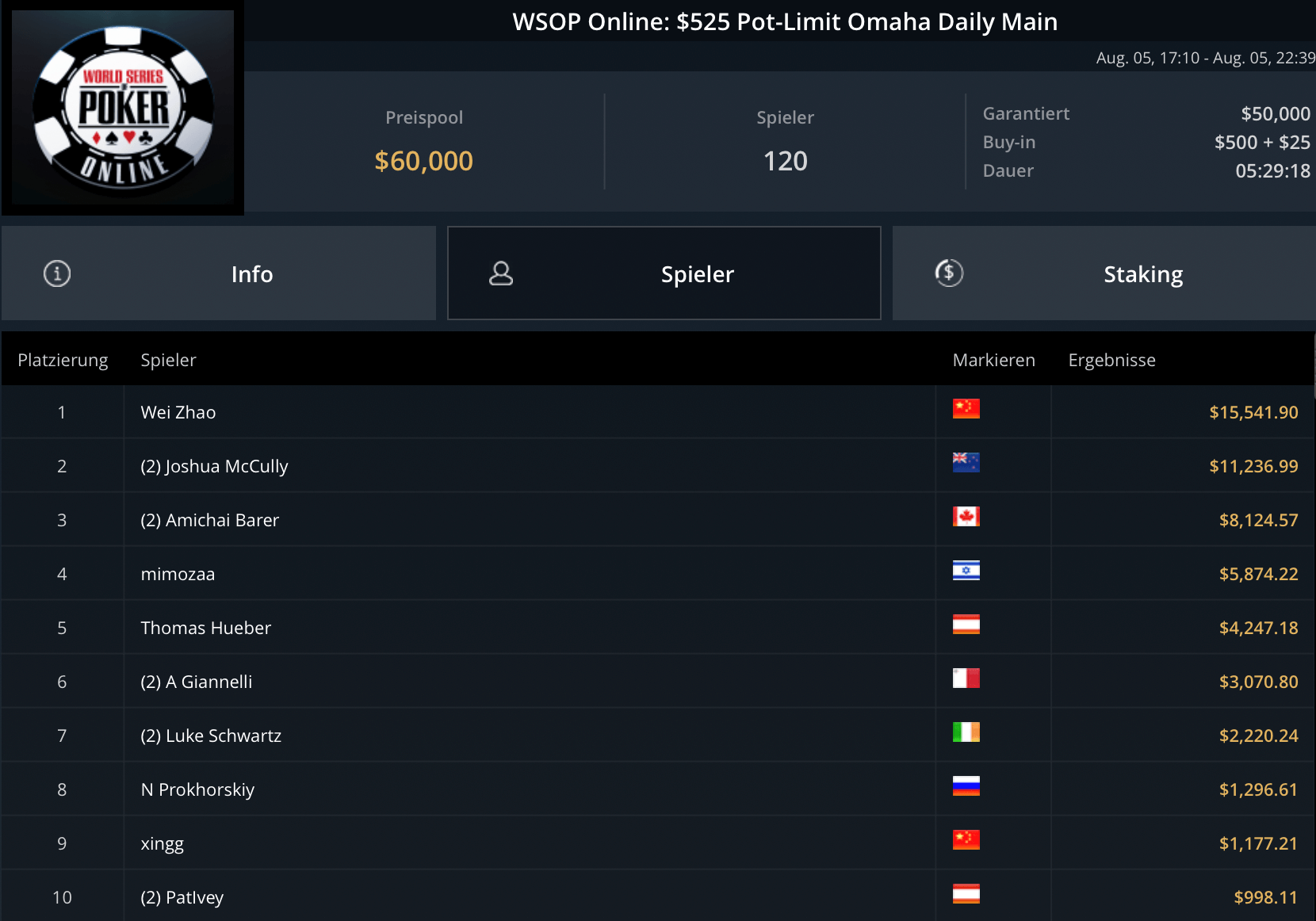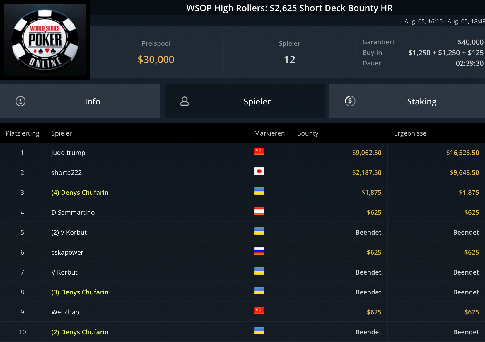 Auf den Sieger wartet $161.636, alle Spieler haben $5.371 sicher. Unter den DACH-Spielern sind noch der Deutsche (unter AT-Flagge) Leonard Maue, als „LottoLarry“ auf GGPoker unterwegs, mit 20 BB auf Platz 21 und „Pwndidi“ auf Platz 24 als Shortstack mit grade Mal 4 BB mit dabei.