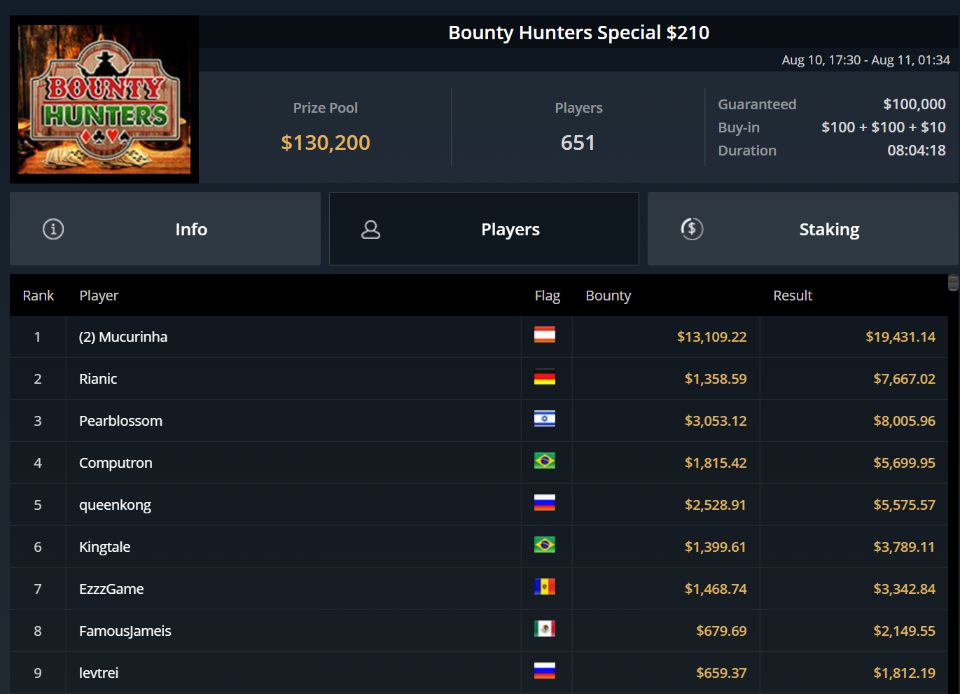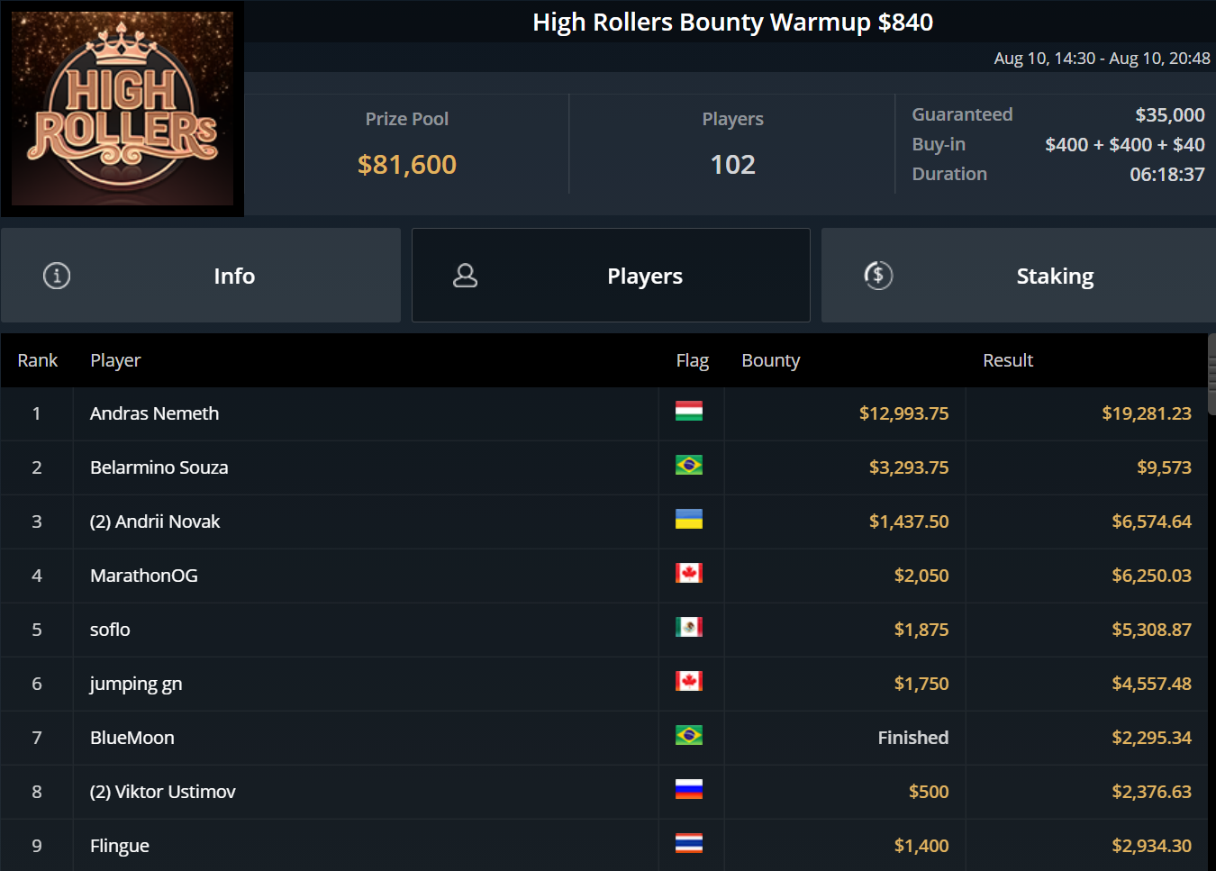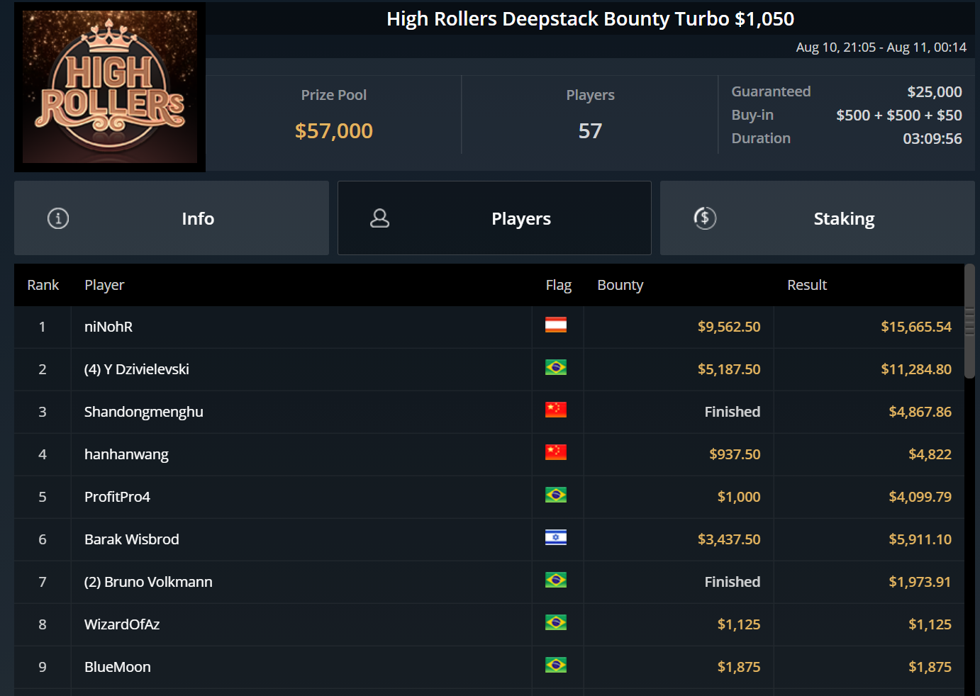Auch Chris Pütz machte mit Platz 6 beim $525 High Rollers Daily Special auf sich aufmerksam, während der Sieger beim $210 Bounty Hunters Special „Mucurinha“ aus Brasilien fälschlicherweise als Österreicher geführt.