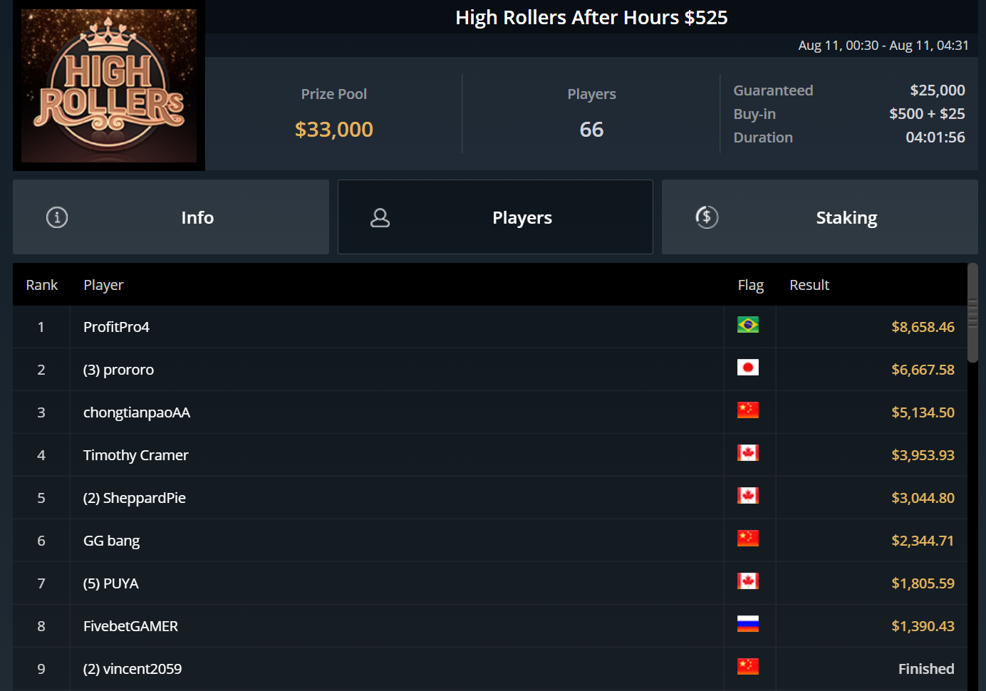Bei noch drei Spielern verlor er mit Damen seine restlichen Chips an Andras Nemeth, der mit AK ein Ass traf.