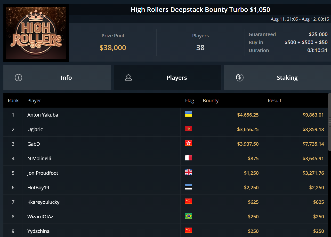 Bei den High Rollers gingen die DACH-Spieler leer aus, größter Gewinner war „Flingue“, der für seinen Sieg beim $840 High Rollers Bounty Warmup mehr als $10.000 einstrich.