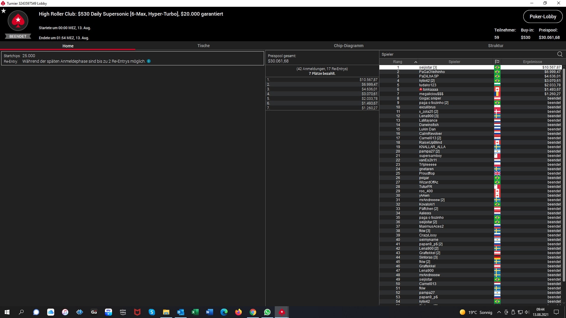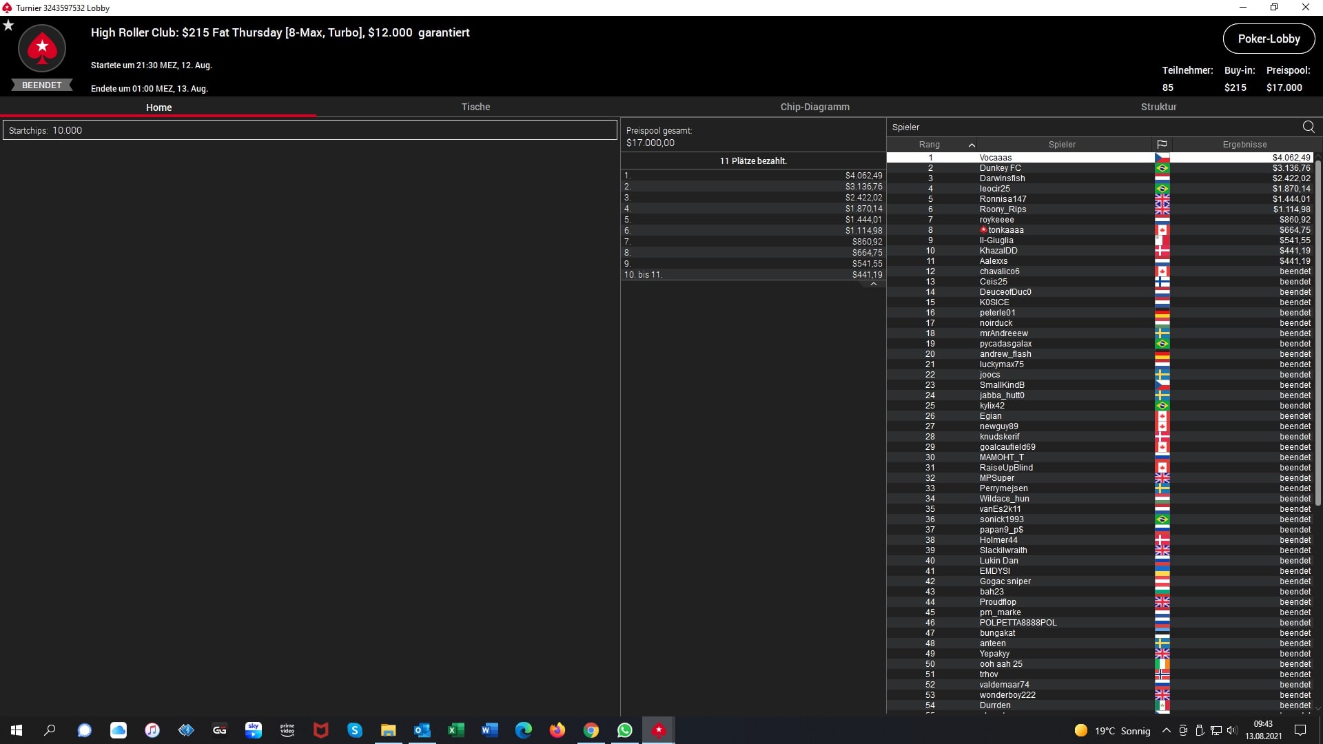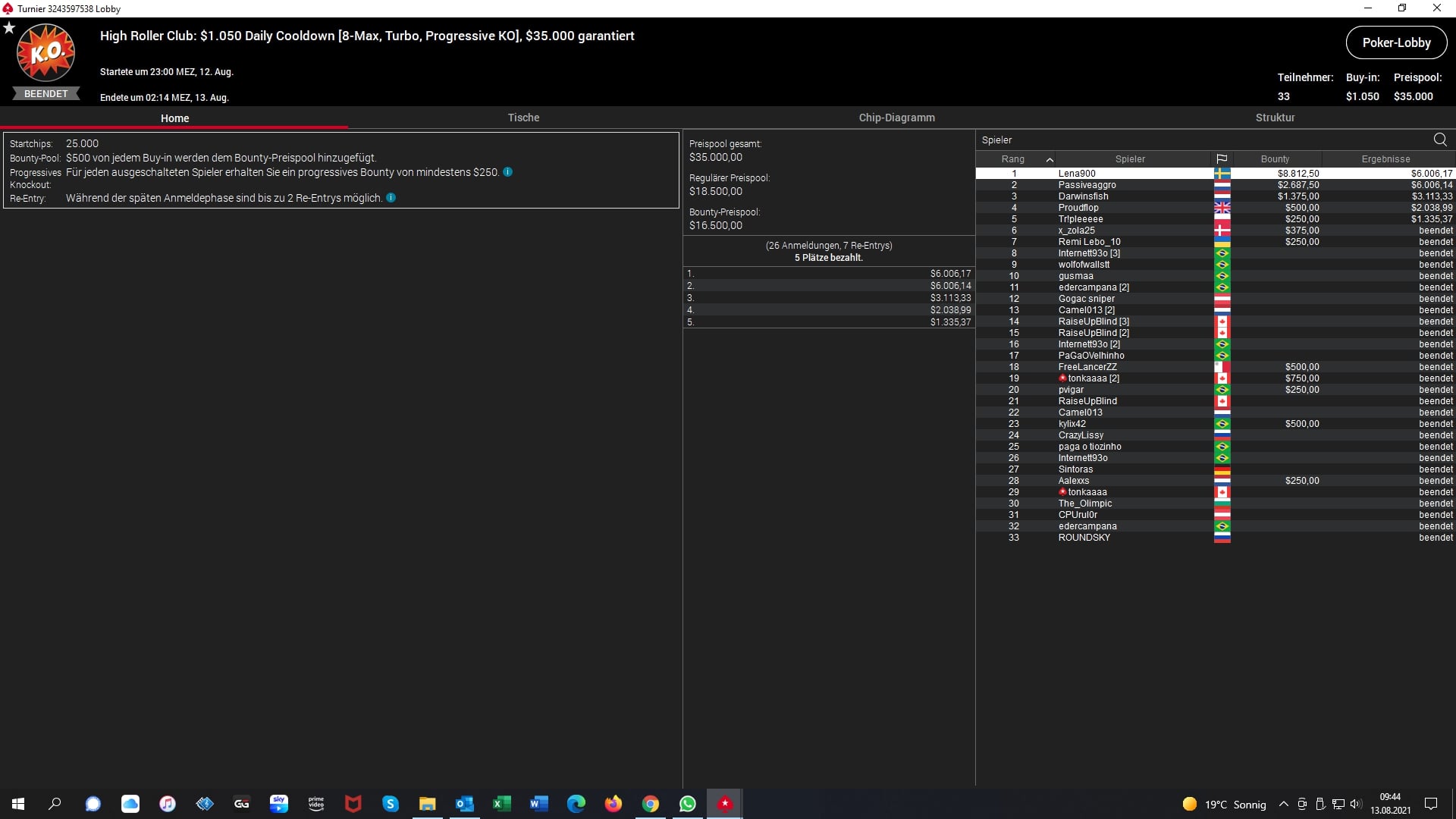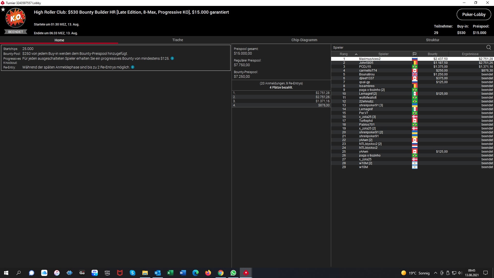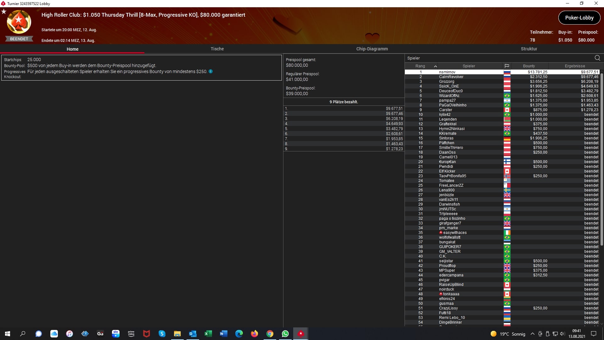 Die besten Ergebnisse für die DACH-Gemeinde gab es beim $1.050 Thursday Thrill. Hier belegte Claas „Ssick_OnE“ Segebrecht einen starken Platz 3 für $6.208 + $1.906 Bounties. Der Österreicher „Grozzorg“ schaffte es sogar bis ins Heads-Up und wurde schließlich Zweiter für $9.677 + $2.312 Bounties. Den Sieg und $9.677 + $13.781 Bounties schnappte sich am Ende der Russe „nsmirov“.