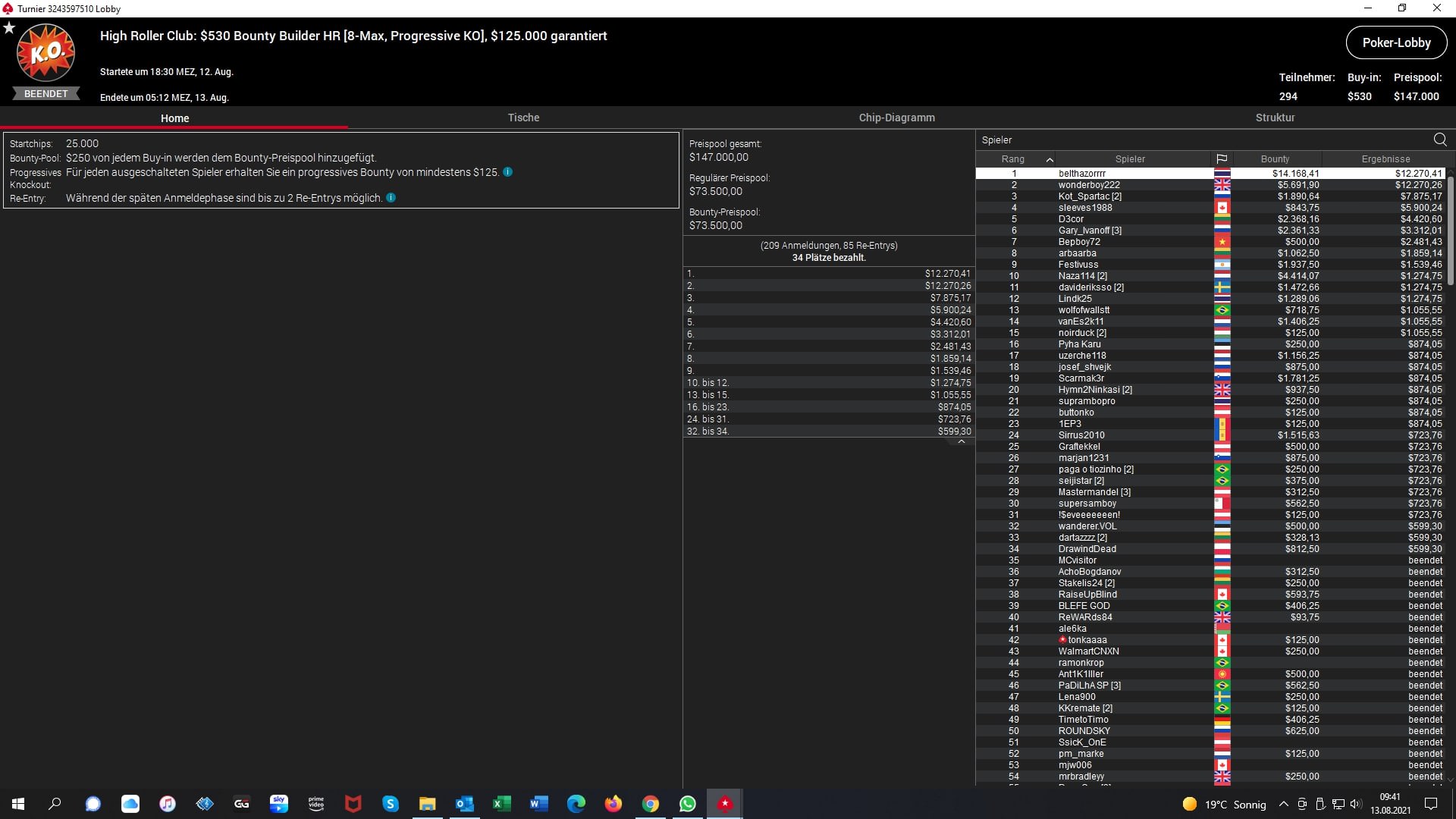 Das größte Turnier des Tages war mit 294 Entries und $147.000 Preispool das $530 Bounty Builder High Roller Event. Hier triumphierte „belthazarrrr“ aus Thailand und cashte $12.270 + $14.168 Bounties. Bester DACH-Spieler wurde „buttonko“ (AUT) auf Platz 22 für $874 + $125 Bounties.