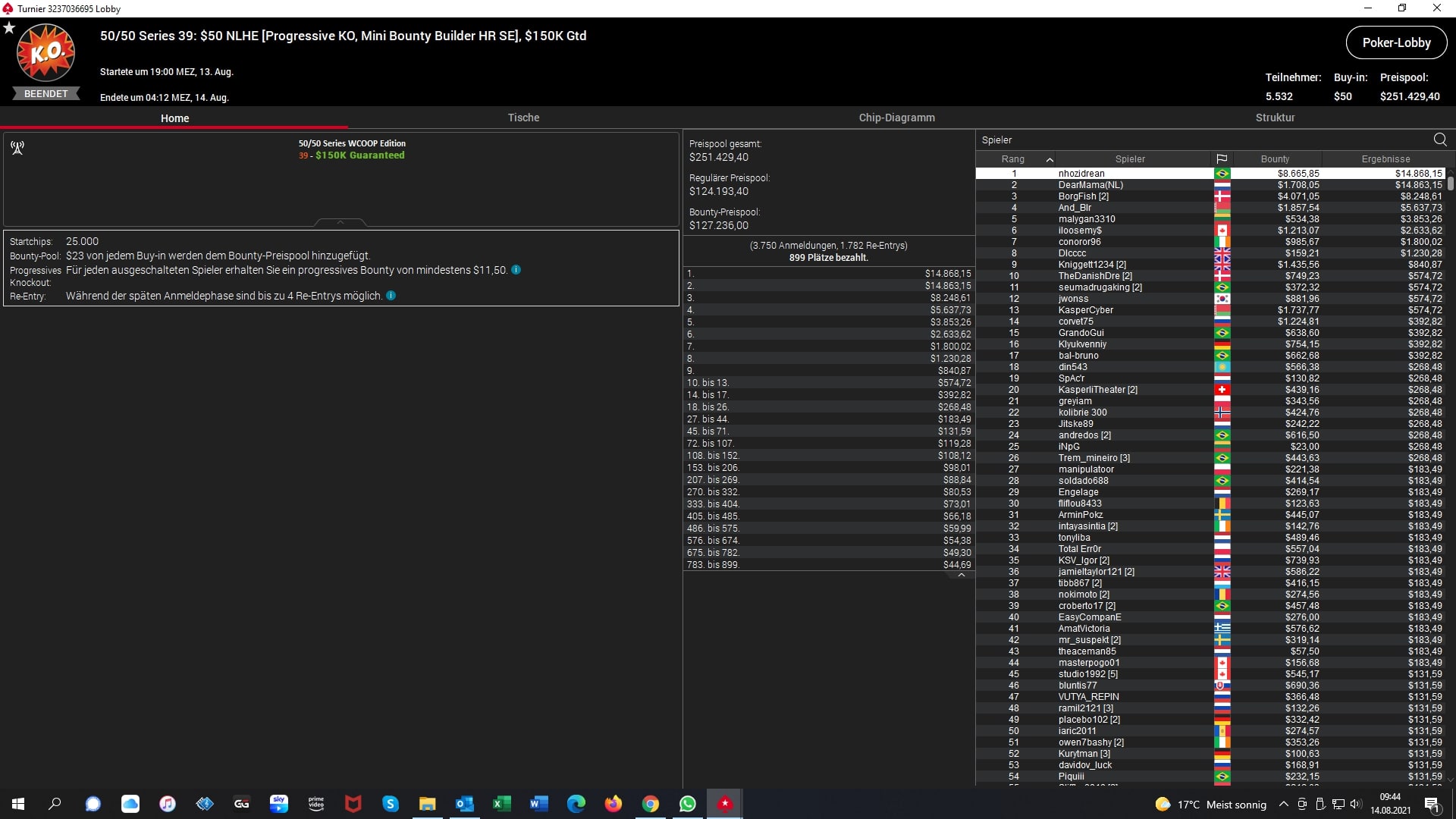 Den größten Preispool gab es beim $50 PKO Mini Bounty Builder High Roller Event #39. Hier bauten 5.532 Entries einen Preispool von $251.429 auf. Den Titel schnappte sich für $14.868 + $8.665 Bounties der Brasilianer „nhozidrean“. Als bester DACH-Spieler belegte „Klyukvenniy“ aus Deutschland den Platz 16 für $392 + $754 Bounties.