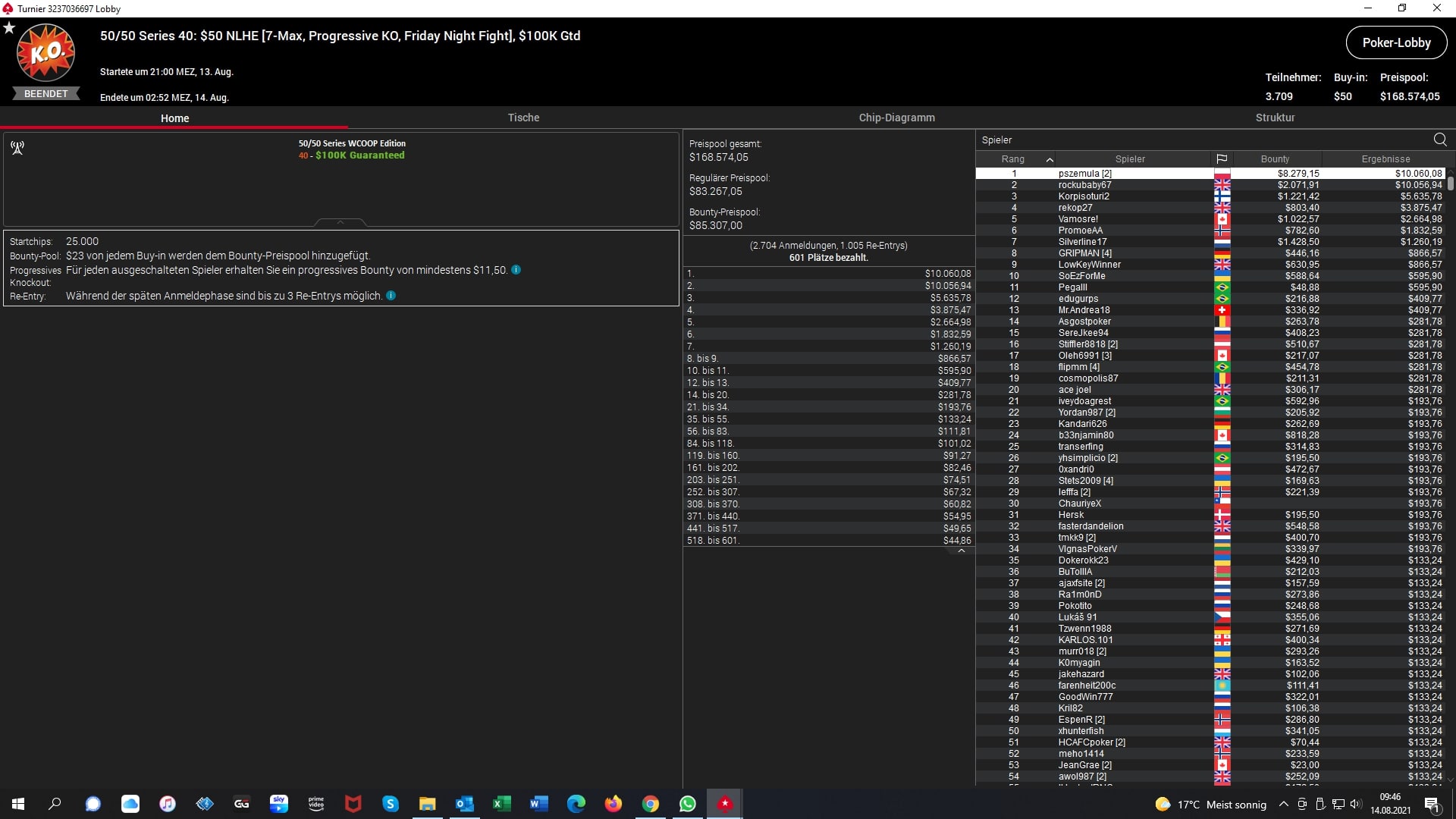 Zwar gab es am Tag 13 nur drei Events, doch die waren durchweg gut besucht. Für die deutschsprachigen Teilnehmer gab es allerdings nicht viel zu holen. Lediglich „GRIPMAN“ aus Deutschland schaffte es an den Final Table des $50 PKO Friday Night Fight Event #40 und belegte Platz 8 für $866 + $446 Bounties. Der Sieg und $10.060 + $8.279 Bounties gingen an den Polen „pszemula“.