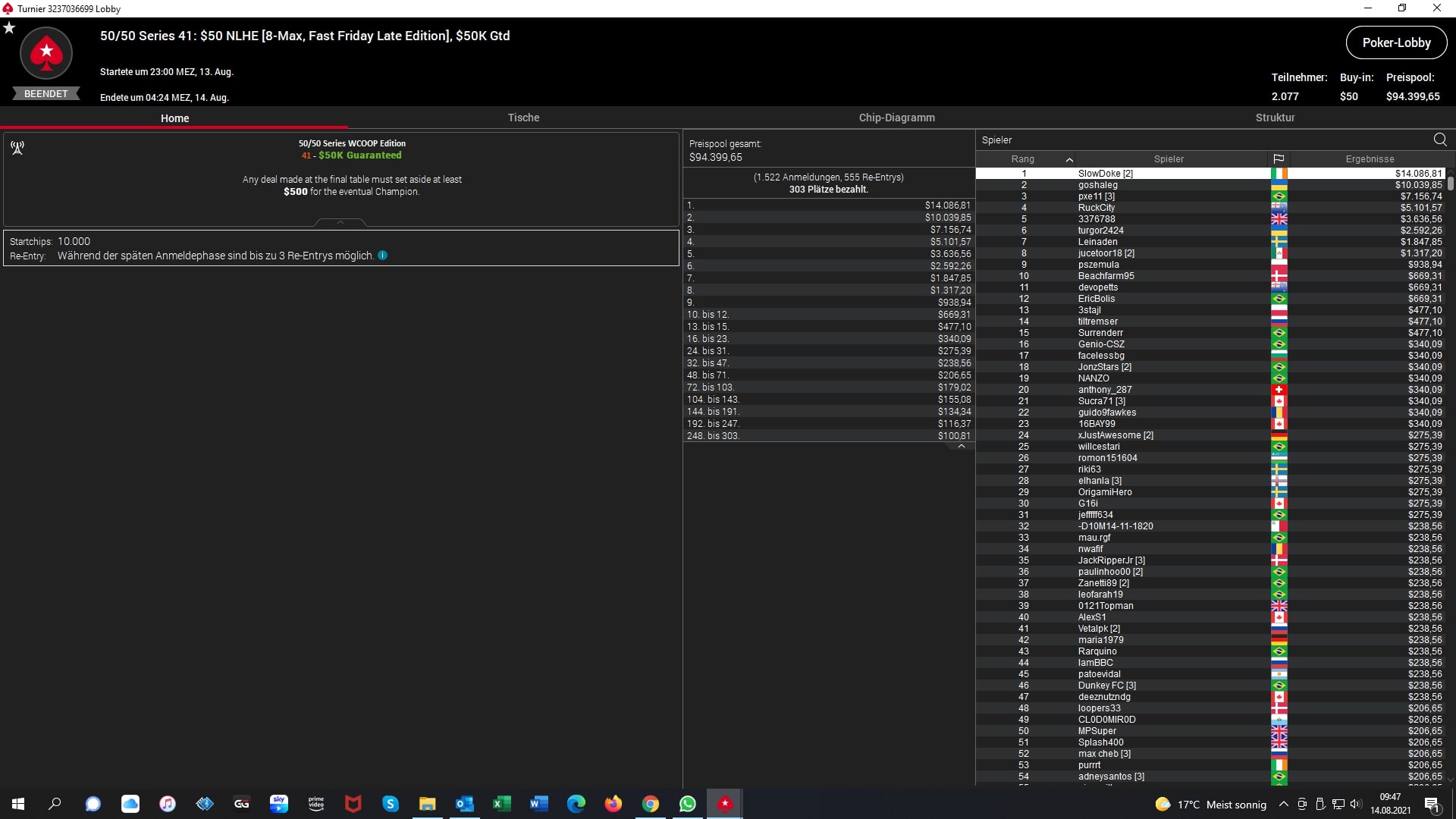 Dann gab es noch das $50 Fast Friday Late-Edition Event #41. Hier triumphierte „SlowDake“ aus Irland und cashte $14.086. Platz 20 holte sich der Schweizer „anthony_287“ für $340.