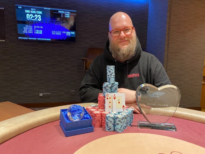 Das Highlight des Tages war das €230+€20 Royal Class Turnier bei dem €10.000 garantiert waren. Insgesamt fanden sich 75 Spieler und Spielerinnen an den Tischen ein und hinzu kamen noch 19 Re-Entries. Damit ging es um ein Preisgeld von €21.620, das unter den besten Elf verteilt wurde. Die Entscheidung fiel schließlich durch einen 4-Way ICM Deal. Hier durfte sich Marc Gork (GER) über den offiziellen Sieg und €4.020 freuen.