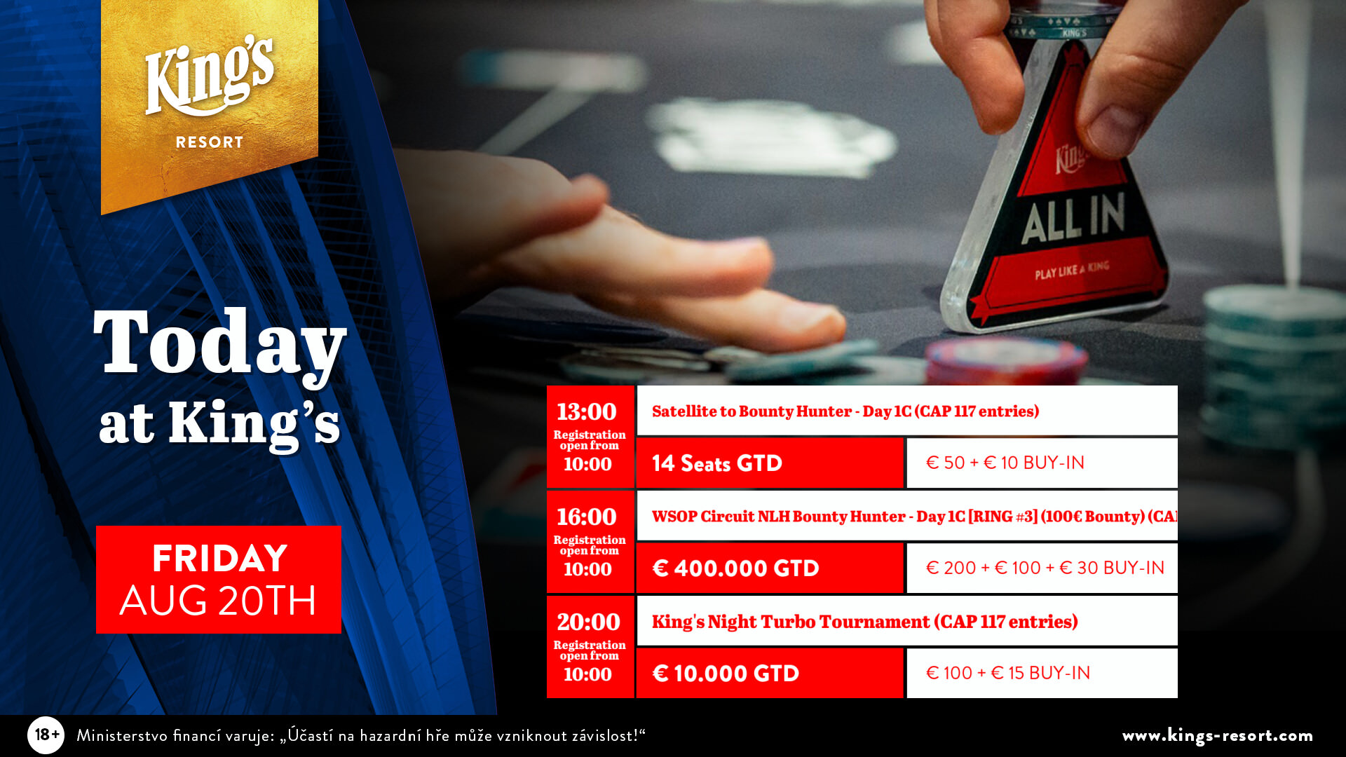 Im King’s gibt es am Freitag ab 13:00 Uhr die Möglichkeit eins von zehn garantierten Tickets für den Tag 1c des $330 WSOPC Bounty Hunters Events, beim €50+€10 Satellite zu gewinnen. Es gibt ein CAP von 117 Entries und die Registrierung startet um 10:00 Uhr.