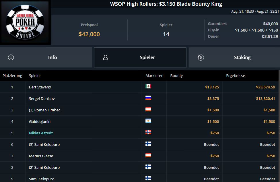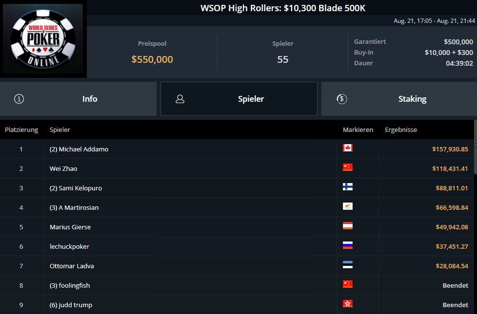 Im High Roller-Segment überzeugte einmal mehr Marius Gierse mit Platz fünf beim $10.300 Blade $500K. Insgesamt gab es hier 55 Entries, im Preispool lagen damit $550.000. Gierse kassierte $49.942,08 Preisgeld, während Michael Addamo als Gewinner satte $157.930,85 abräumte.