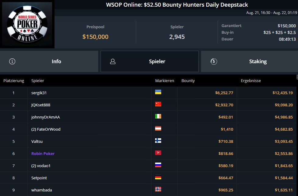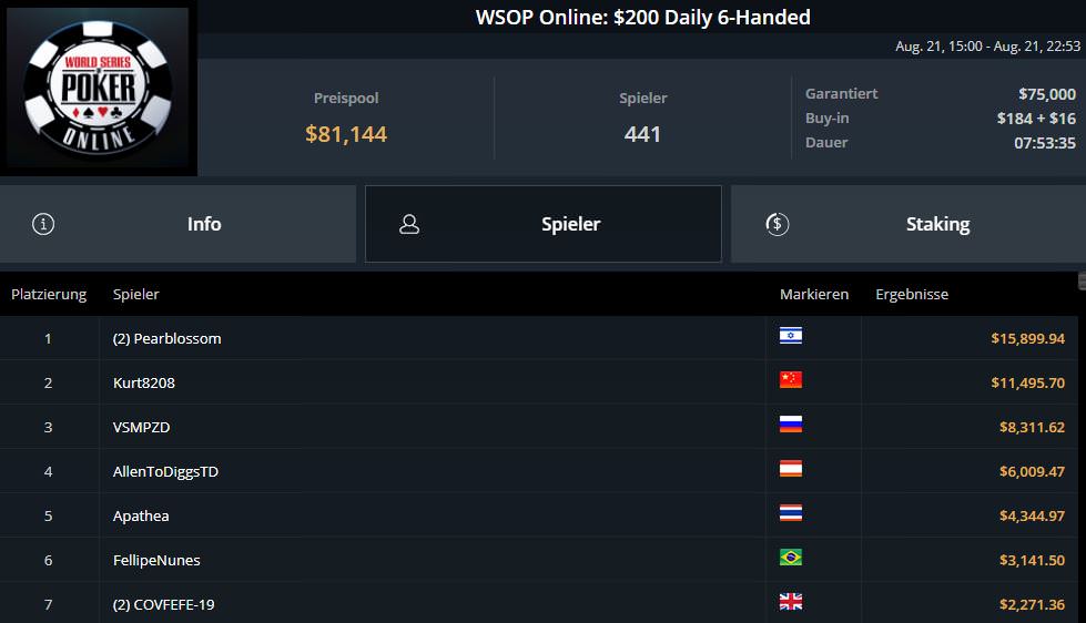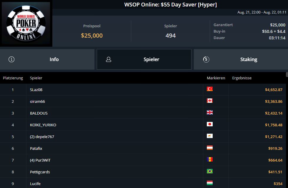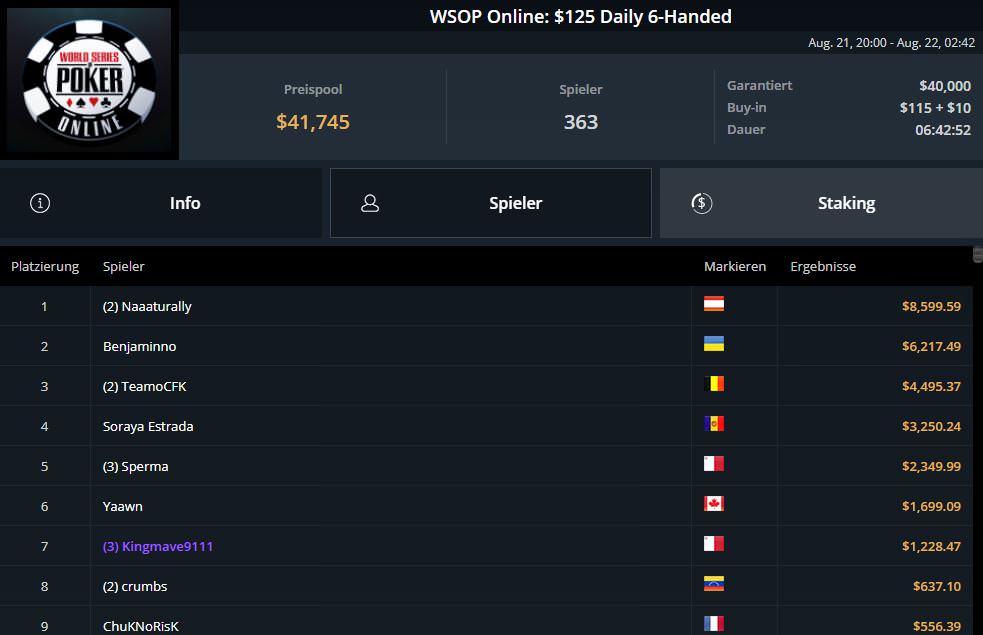 Ebenfalls ganz nach vorne preschte Naaaturally aus Österreich beim $125 Daily 6-Handed (Preispool $41.745) und dafür gab es $8.599,59 Prämie ausbezahlt.