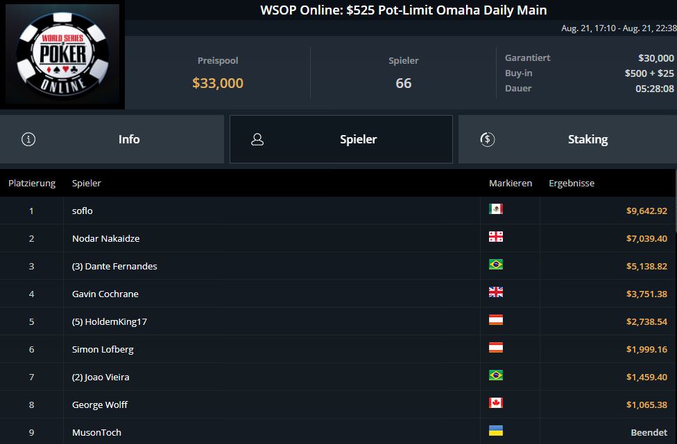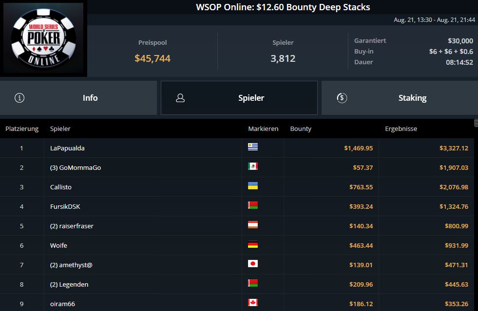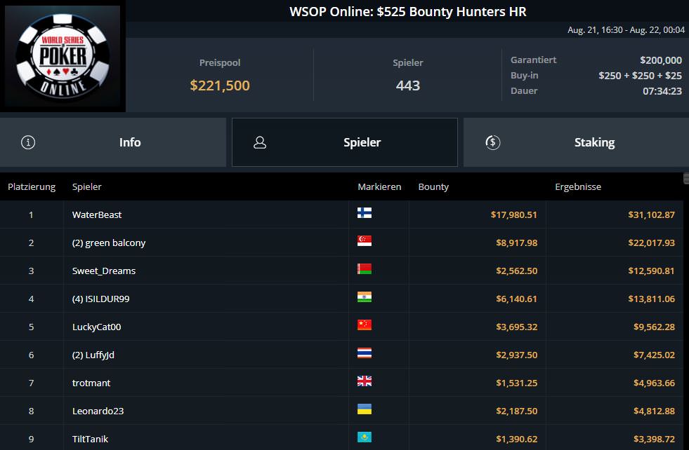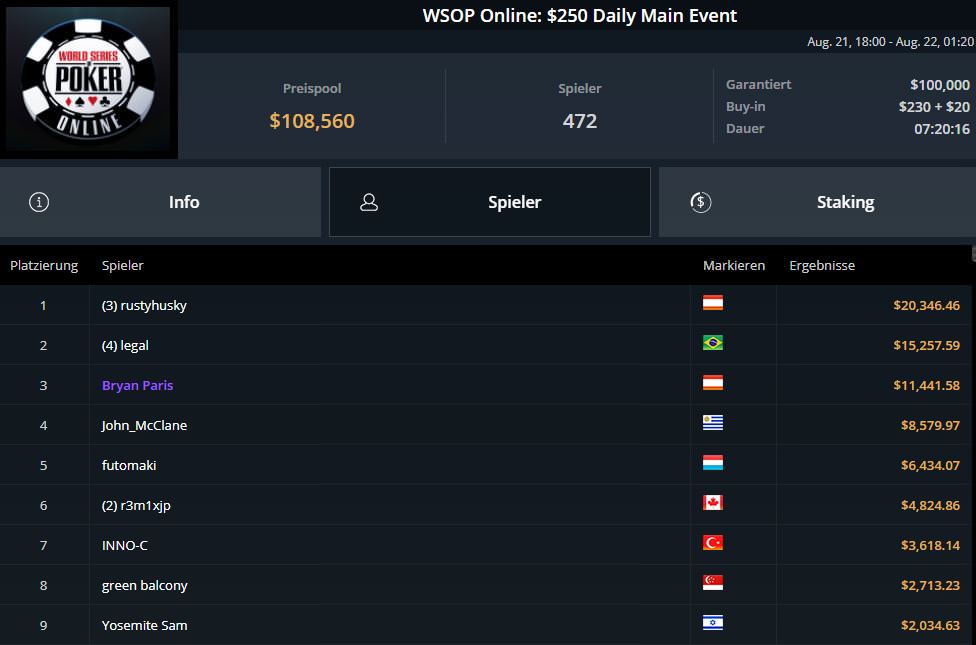 Bei den Side Events waren die deutschsprachigen Spieler dagegen sehr erfolgreich unterwegs. Den größten Wurf landete Lukas rustyhusky Hafner, der vor knapp zwei Wochen Platz zwei für knapp $1 Million Preisgeld beim Millionare Maker belegt hatte. Eine Million gab es für den Sieg beim $250 Daily Main Event nicht, aber $20.346,46 Prämie können sich natürlich sehen lassen.