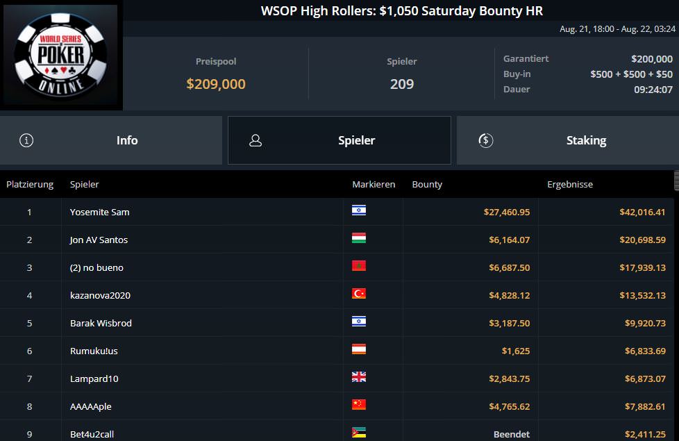 Ursprünglich war die maximale Anzahl Spieler mit 128 festgelegt, doch aufgrund der großen Nachfrage, erhöhte GGPoker die Anzahl auf 256. Letztlich gingen dann 161 Spieler an den Start, sodass der Preispool mit $1.531.700 gefüllt ist bzw. war. Denn bei 16 bezahlten Plätzen, wurden zwölf Spieler bereits ausbezahlt.