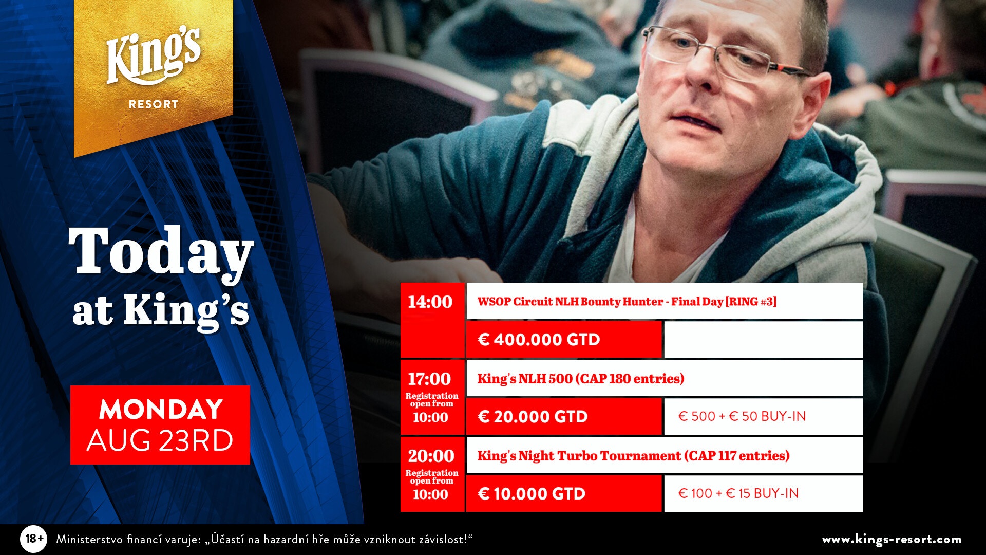 Heute geht es im King’s um 14 Uhr mit dem Finaltag beim WSOPC Bounty Hunter weiter (der Livestream beginnt um 14:30 Uhr). Am Abend starten dann um 17 Uhr ein weiteres €500+€50 King’s NLH 500 mit €20.000 GTD und um 20 Uhr das €100+€15 King’s Night Turbo mit €10.000 GTD.