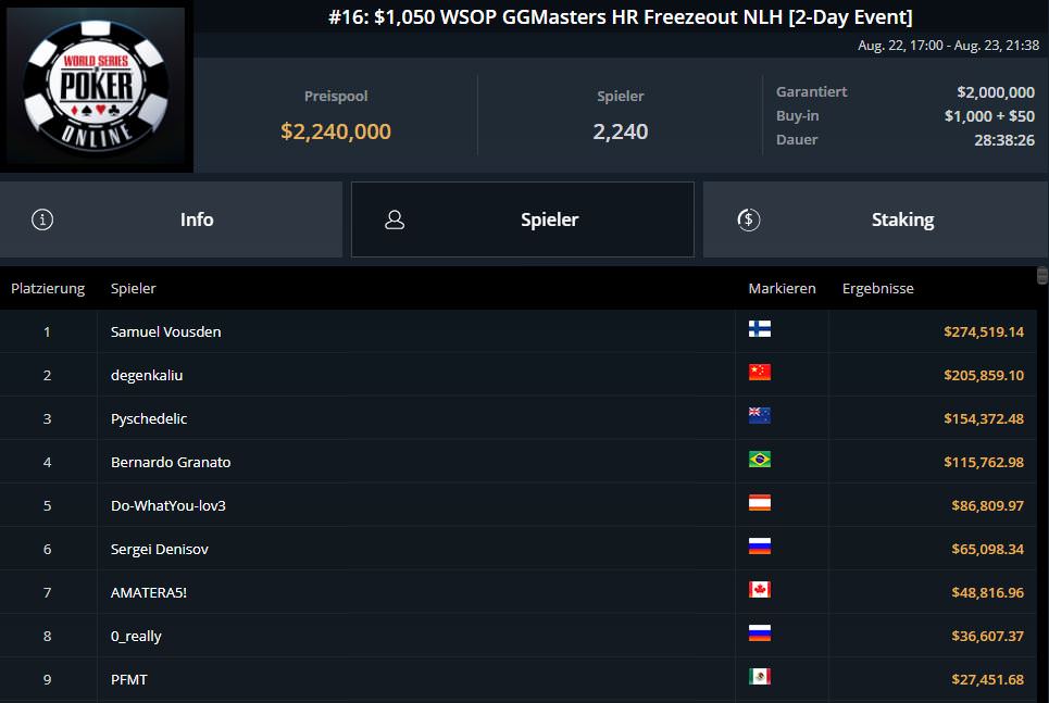 Der Finne Samuel Vousden hat sich das nächste Bracelet der World Series of Poker Online 2021 geschnappt. Auf GGPoker gewann er gestern Abend das $1.050 WSOP GGMasters HR Freezeout (Event #16).