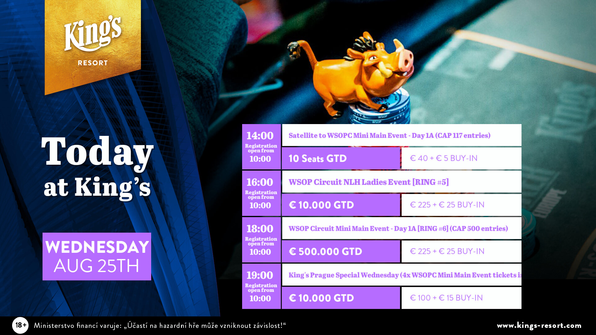 Heute fällt im King’s um 16 Uhr der Startschuss zum €225+€25 WSOP Circuit NLH Ladies Event (Ring #5) mit €10.000 garantiert, zwei Stunden später beginnt der €225+€25 WSOP Circuit Mini Main Event (Ring #6) mit Starttag 1A. Beim Mini Main Event sind €500.000 an Preisgeldern garantiert.
