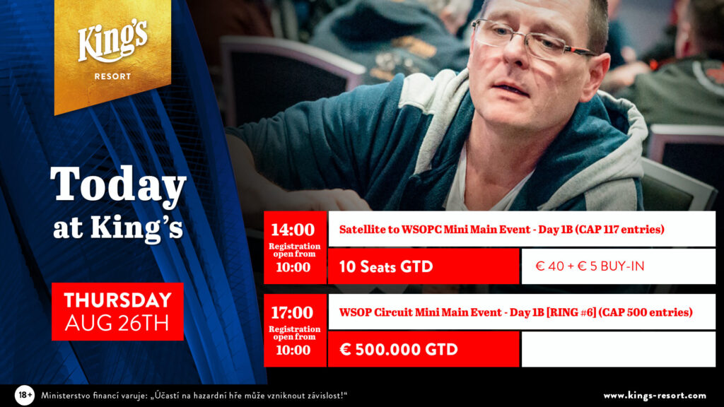 Heute geht es im King’s um 14 Uhr mit einem €40+€5 Satellite 10 Seats GTD für Day B beim WSOPC Mini Main Event weiter. Day 1B beginnt dann am späten Nachmittag um 17 Uhr.
