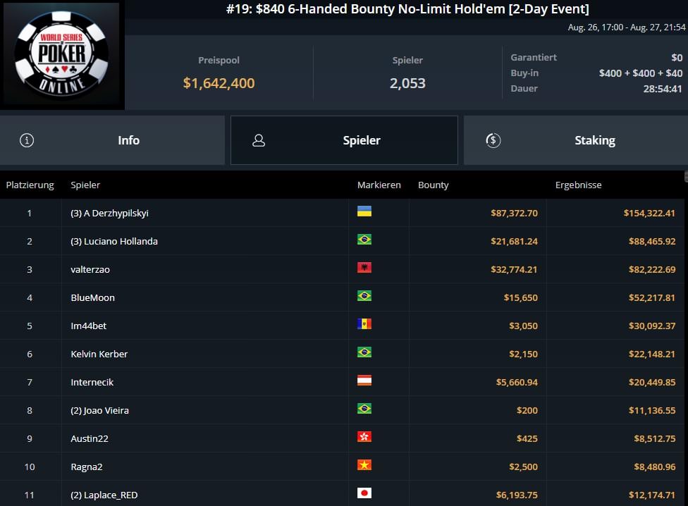Beim $840 WSOP Online 6-Handed Bounty NLH Bracelet Event #19 kamen am Freitagabend die besten 21 von ehemals 2.053 Entries zurück an die virtuellen Tische und kämpften um ihren Anteil am $1.642.000 großen Preispool. Alle Finalisten hatten schon $4.197 + Bounties sicher und für den Champion waren das Bracelet und $66.949 + Bounties reserviert. Mit Pascal Hartmann (GER/AUT) hatten wir auch noch ein heißes Eisen im Feuer das von Rang 4, hinter den drei Brasilianern, startete. Für Pascal lief es allerdings gar nicht gut. Schon auf Platz 13 musste er sich für $14.830 inkl. $9.515 Bounties verabschieden. Das Bracelet sollte auch nicht nach Brasilien gehen. Das Armband und $154.322 inkl. $87.372 Bounties schnappte sich schließlich der Ukrainer Adrii Derzhypilskyi.