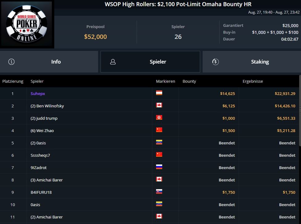 Der Österreicher Fabian „Suhepx“ Rigo konnte sich beim $2.100 WSOP Online PLO Bounty High Roller gegen 25 Gegner durchsetzen und bezwang im Heads-Up Ben Wilinofsky. Dafür gab es ein Preisgeld von $22.931 inkl. $14.625 Bounties.