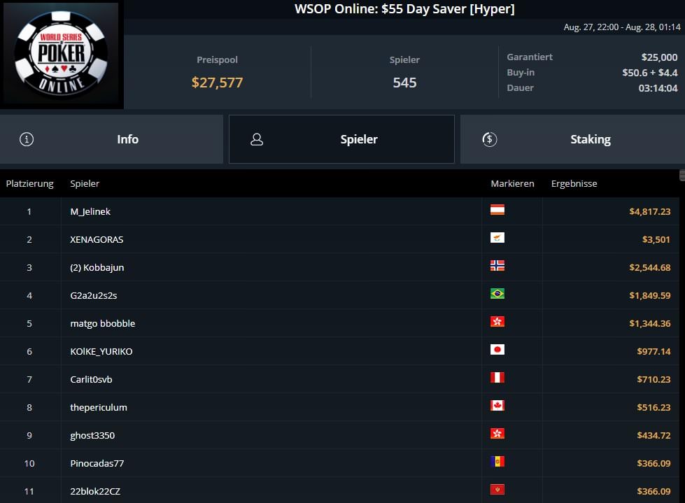 Den zweiten deutschsprachigen Erfolg gab es für den Österreicher „M_Jelinek“. Er ließ beim $55 WSOP Online Day Saver Hyper 544 Gegner hinter sich und nahm ein Preisgeld von $4.817 entgegen.