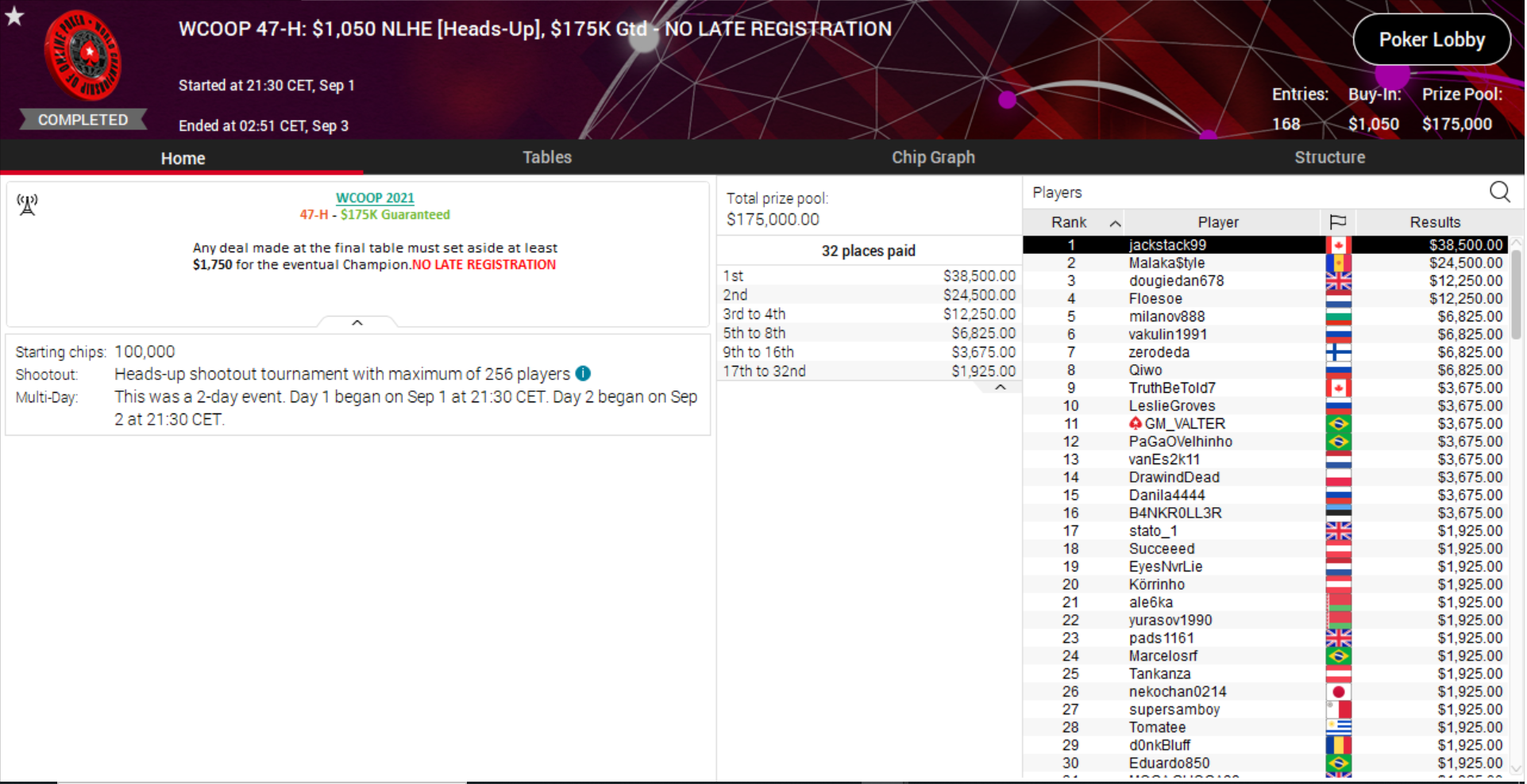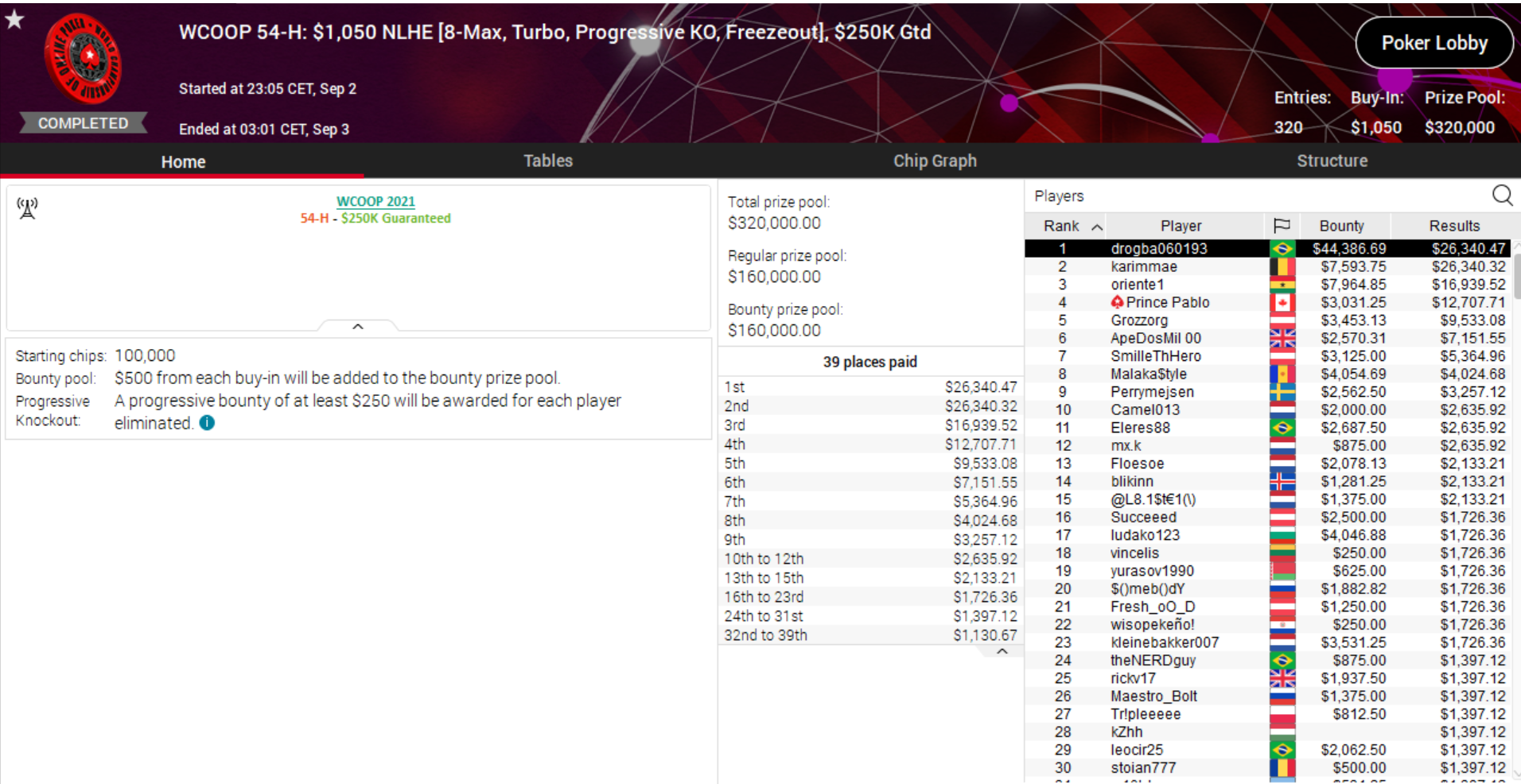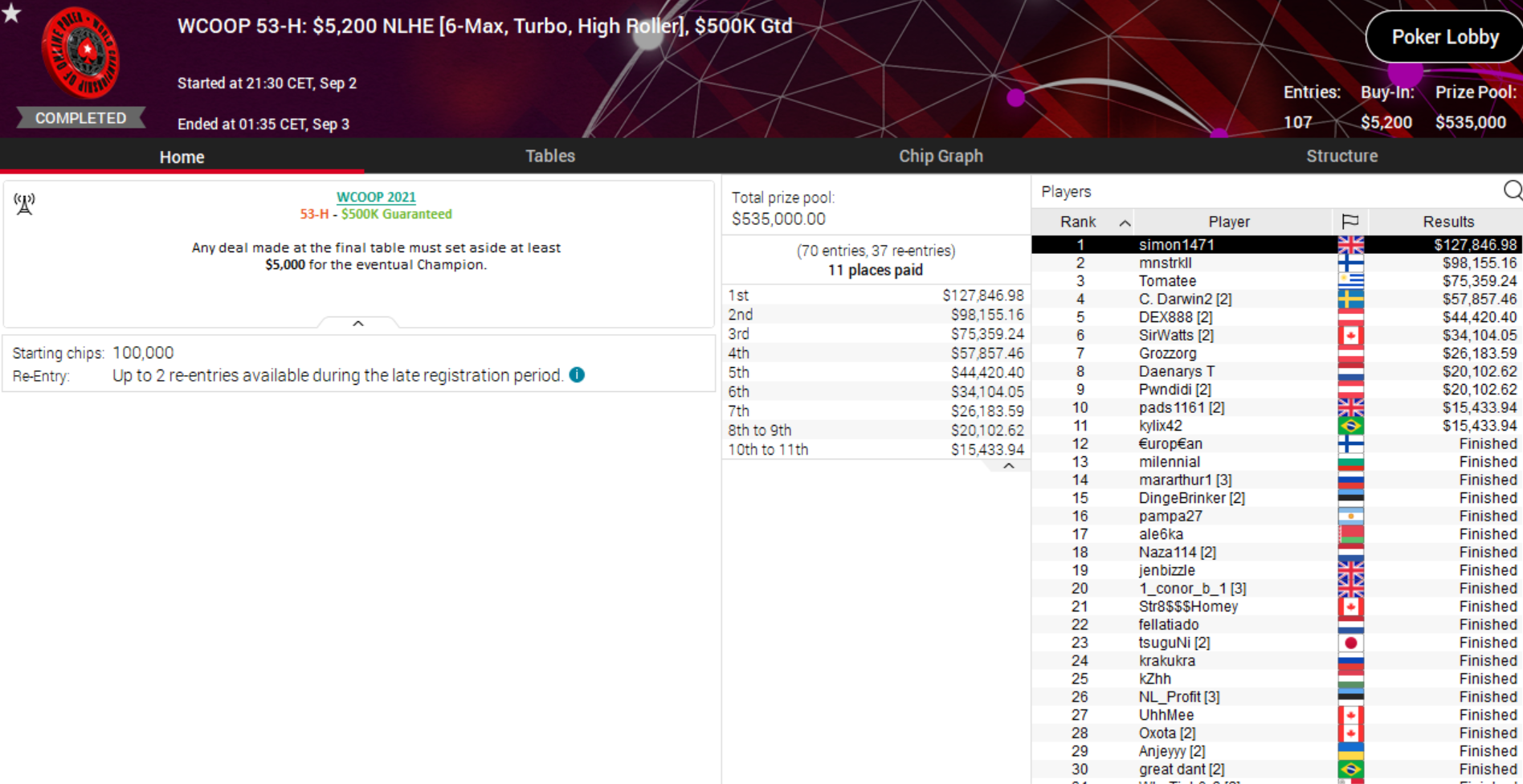 Immerhin Fünfter bzw. Siebter wurden Marius „DEX888“ Gierse und „Grozzorg bei Event 53-H, einem $5.200 NLHE High Roller Turbo.