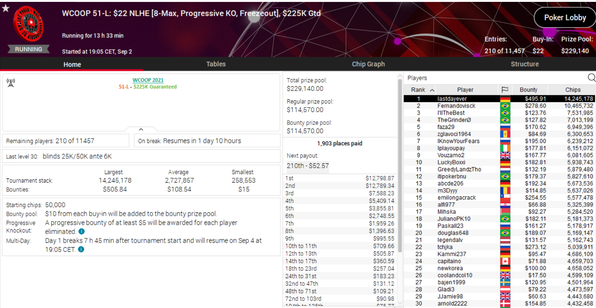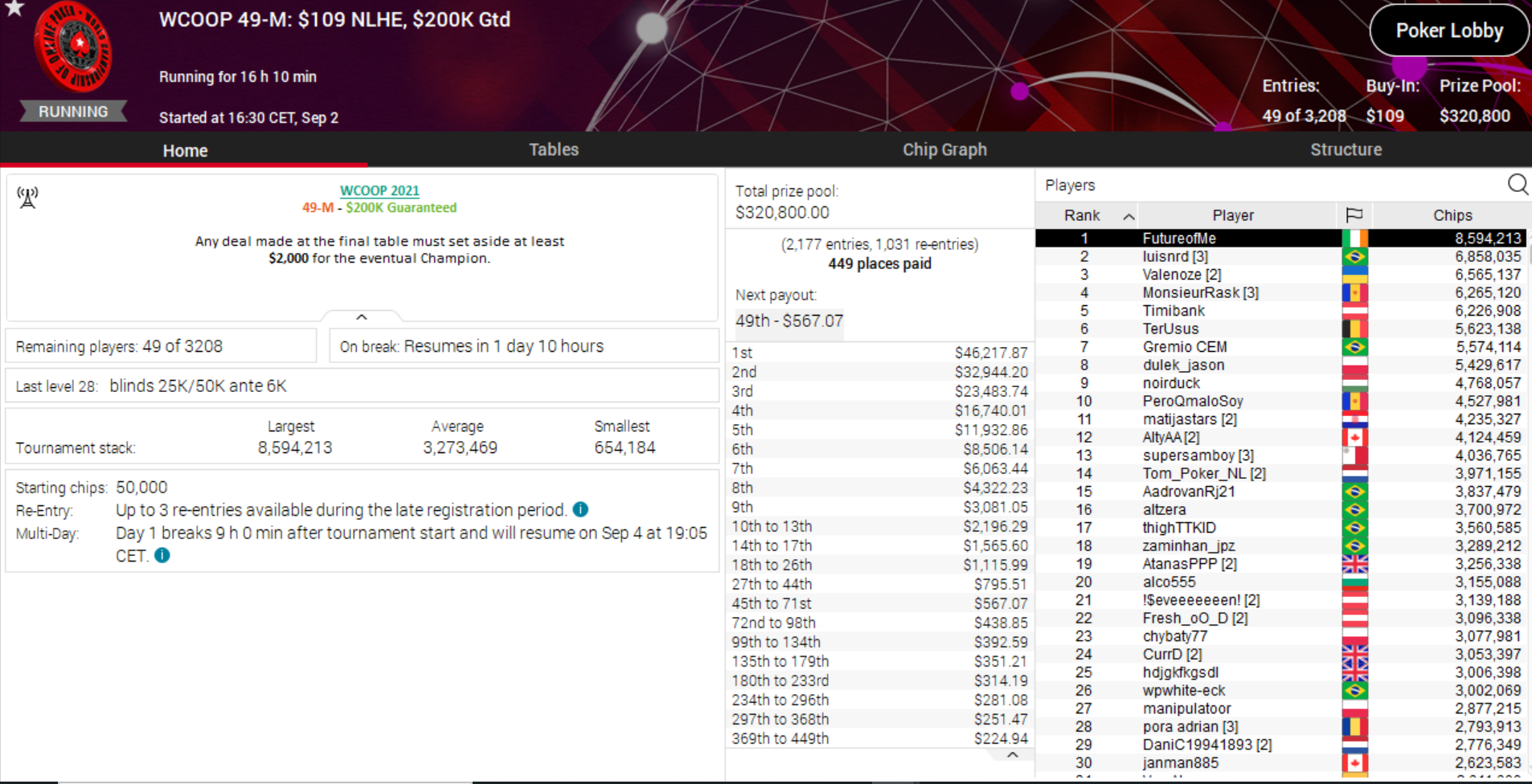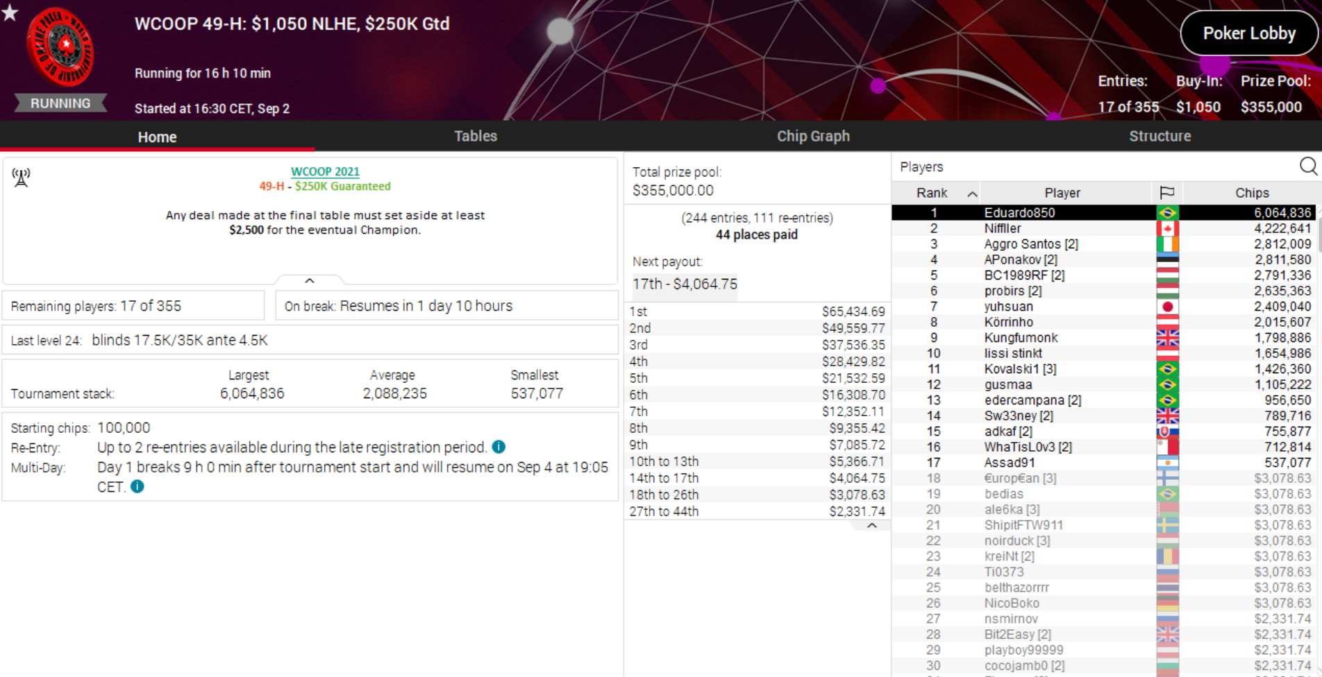Ebenfalls aussichtsreich im Rennen sind Koray „Körrinho“ Aldemir und Christopher „lissi stinkt“ Frank bei Event 49-H. Hier sind noch 17 Spieler bei der Entscheidung dabei, der Sieger erhält gut $65.000.