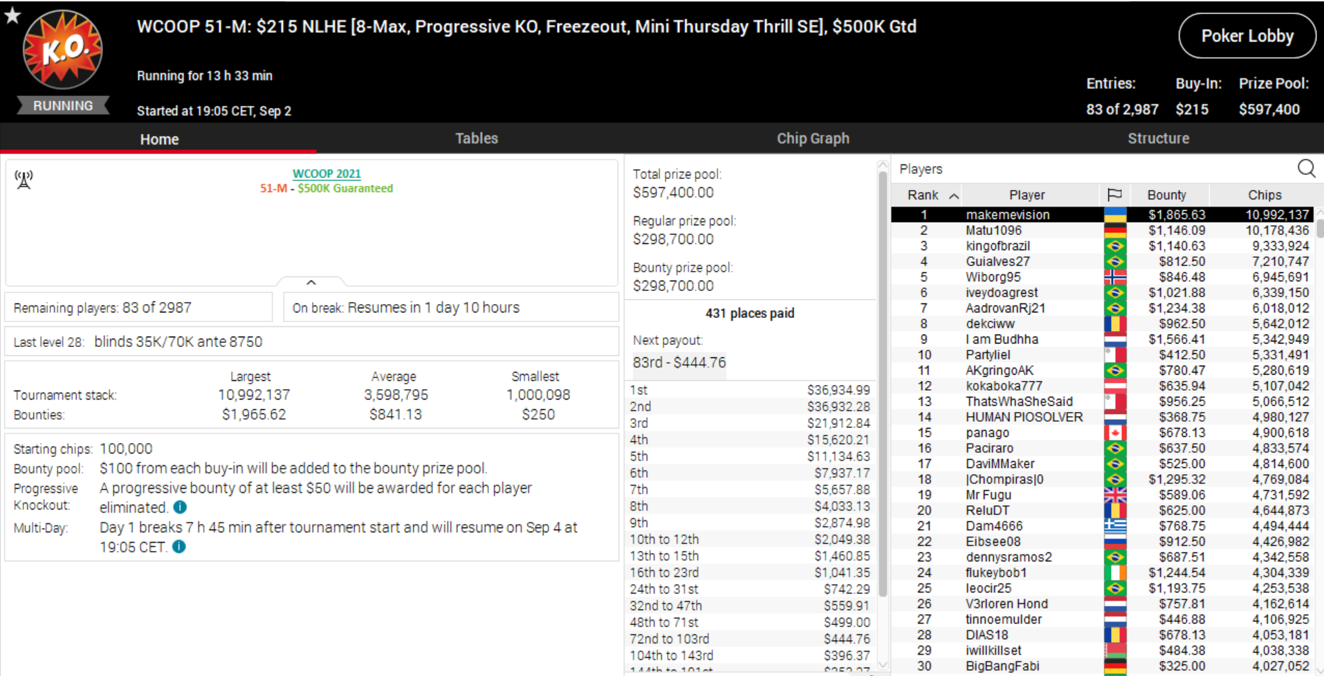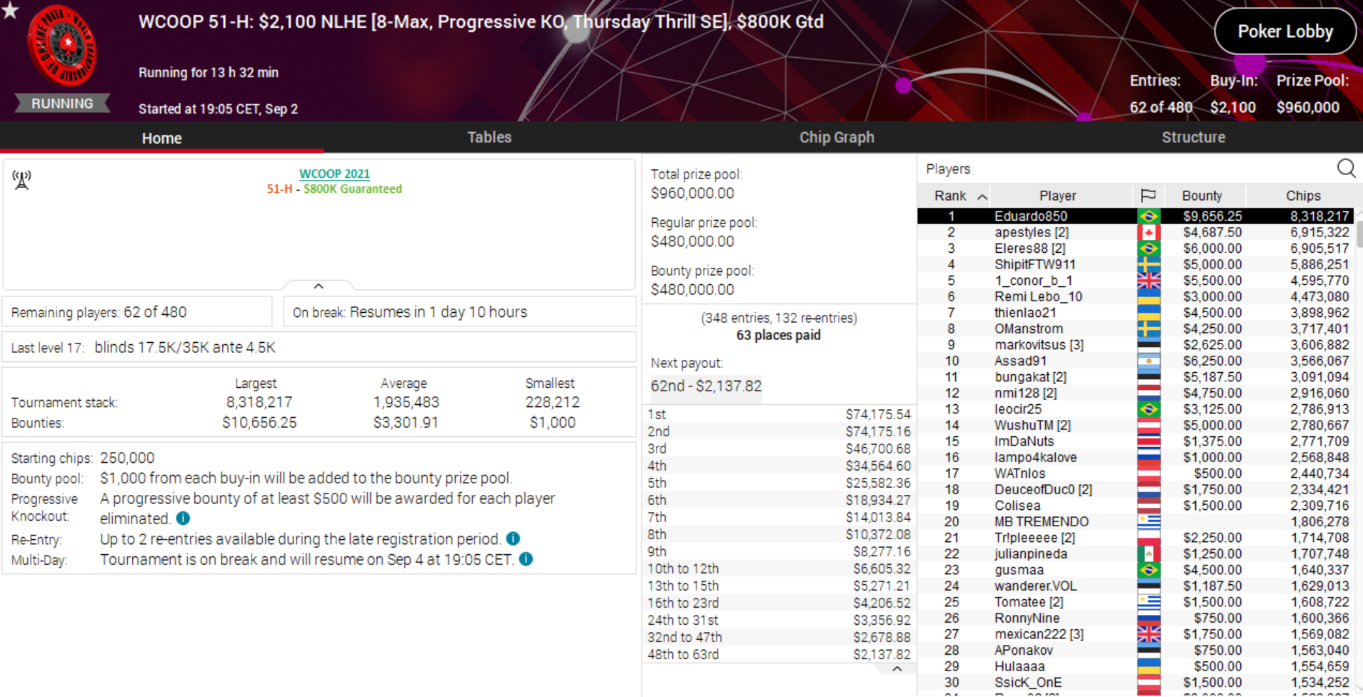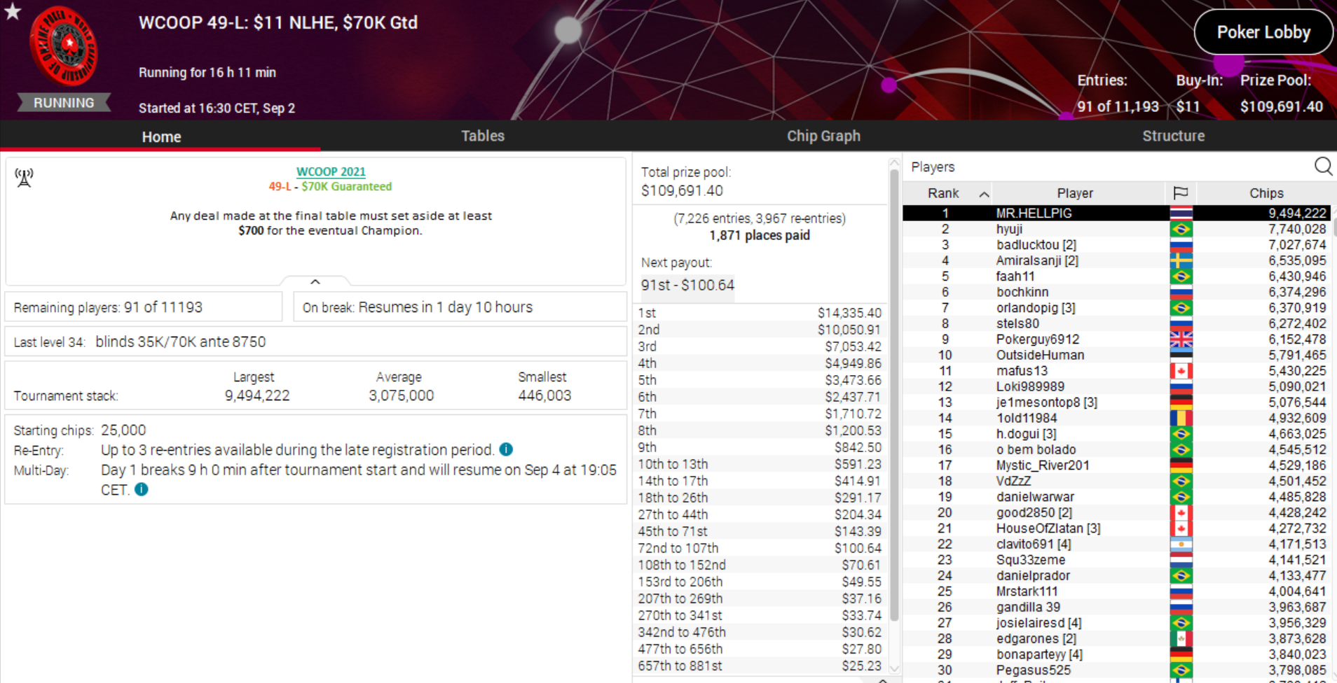 Ebenfalls aussichtsreich im Rennen sind Koray „Körrinho“ Aldemir und Christopher „lissi stinkt“ Frank bei Event 49-H. Hier sind noch 17 Spieler bei der Entscheidung dabei, der Sieger erhält gut $65.000.
