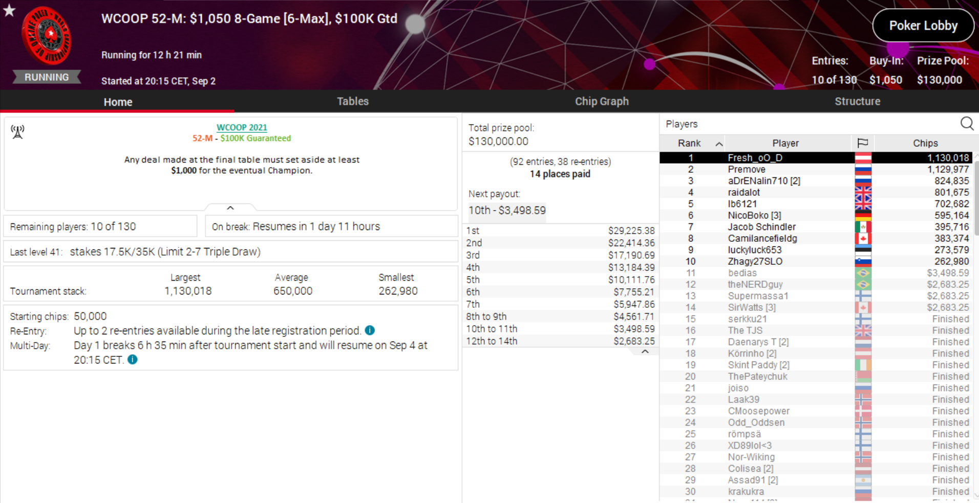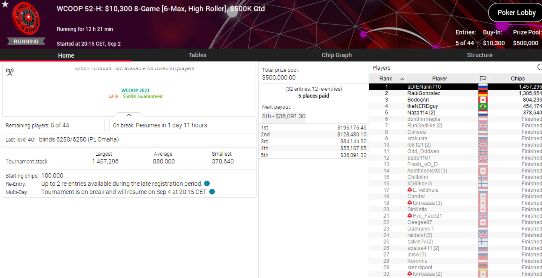 Vor allem bei Event 52, dem 8-Game sieht es gut aus. Jens „Fresh_oO_D“ Lakemeier führt in der mittleren Variante und Johannes „RaúlGonzalez“ Becker liegt bei den 10k High Rollern auf Platz 2 und hat auf jeden Fall gut $36.000 sicher.