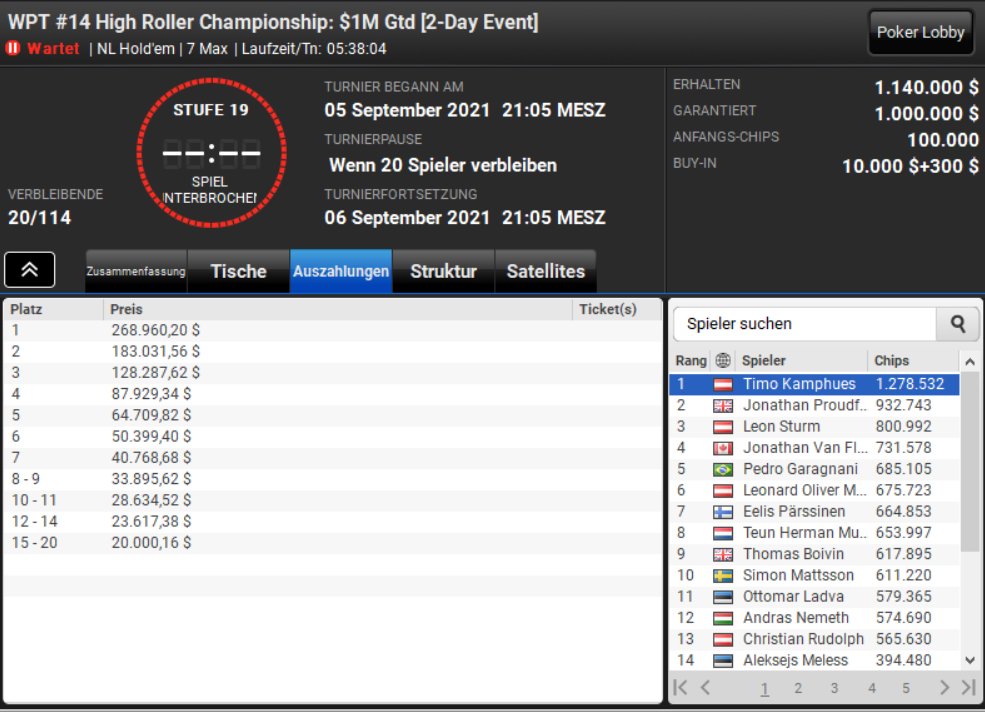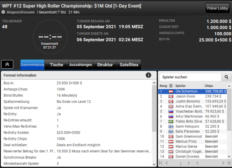 Während Christoph Vogelsang, Markus Prinz und Marius Gierse knapp vor dem Geldrängen ausschieden, war Schemion nicht aufzuhalten und gewann nach einem Sieg im Heads-Up gegen Jason Koon über $388.000 Preisgeld.