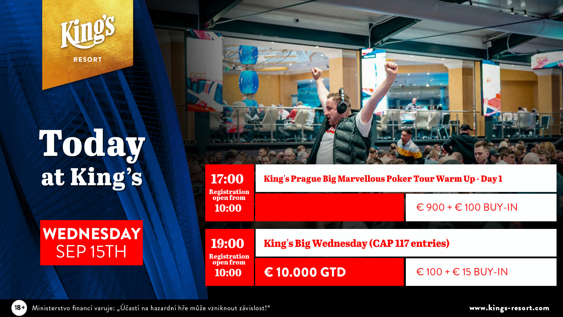 Heute wird im King’s Resort um 17 Uhr Spieltag 1 beim €900+€100 King’s Prague Big Marvellous Poker Tour Warm Up gespielt. Um 19 Uhr startet dann auch noch das €100+15 King’s Big Wednesday mit €10.000 GTD (CAP 117 Entries).