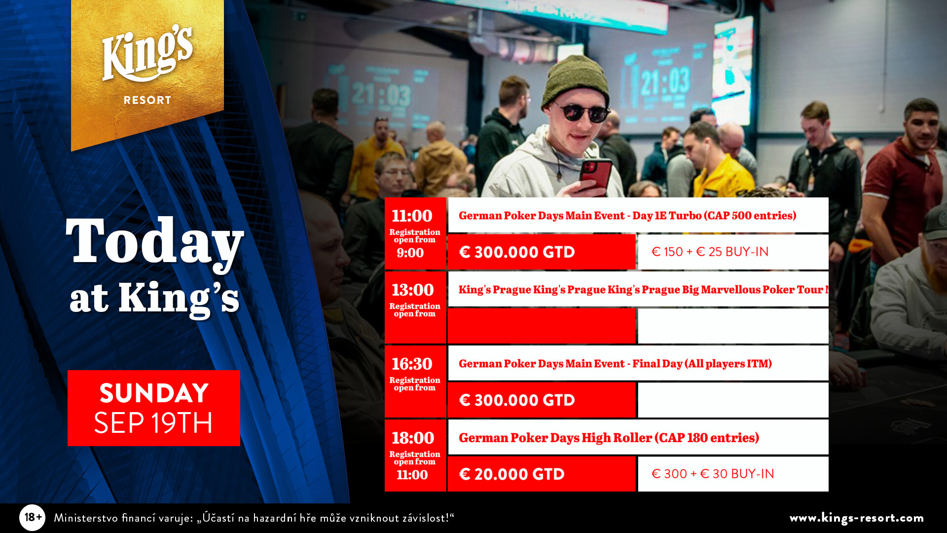 Die German Poker Days (GPD) im King’s Resort Rozvadov sind mal wieder ein Selbstläufer. Beim €175 Main Event waren die Flights 1C und 1D am Samstag ausverkauft, wodurch die Gesamtzahl auf 1.895 Entries ausgebaut wurde.