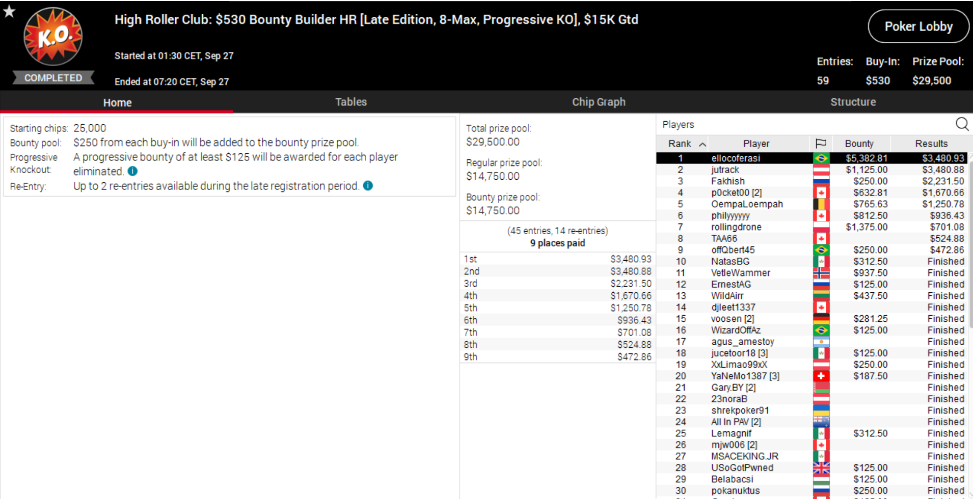 Ein absolutes Spitzenergebnis erzielte zudem Julian „jutrack“ Track beim $530 Bounty Builder Late Edition. Er musste sich nur dem Brasilianer „ellocoferasi“ beugen und kassierte als Zweiter rund $4.500.
