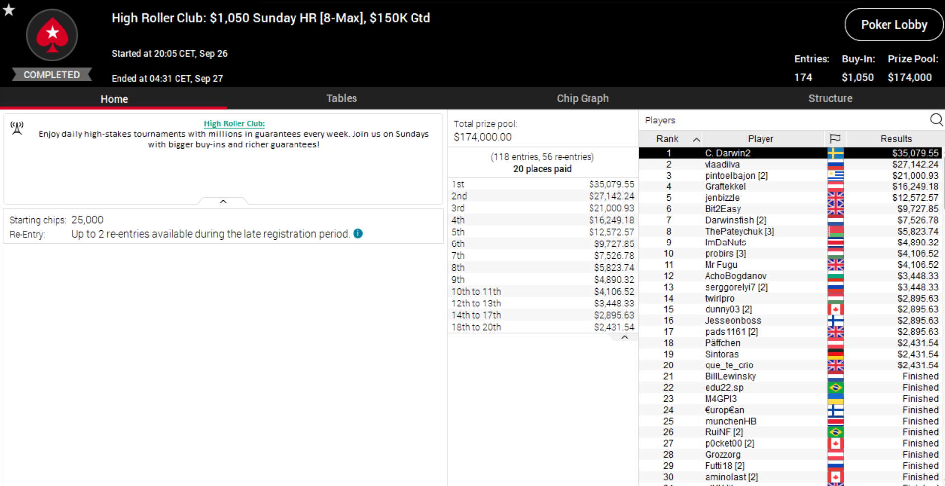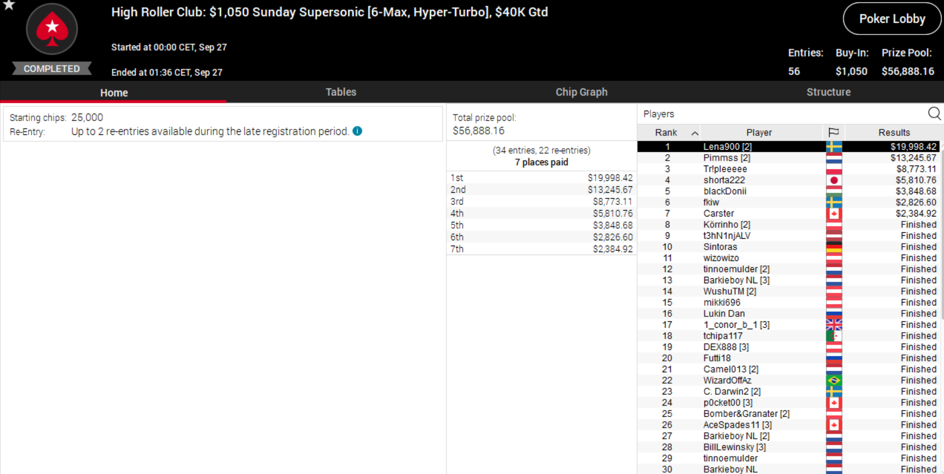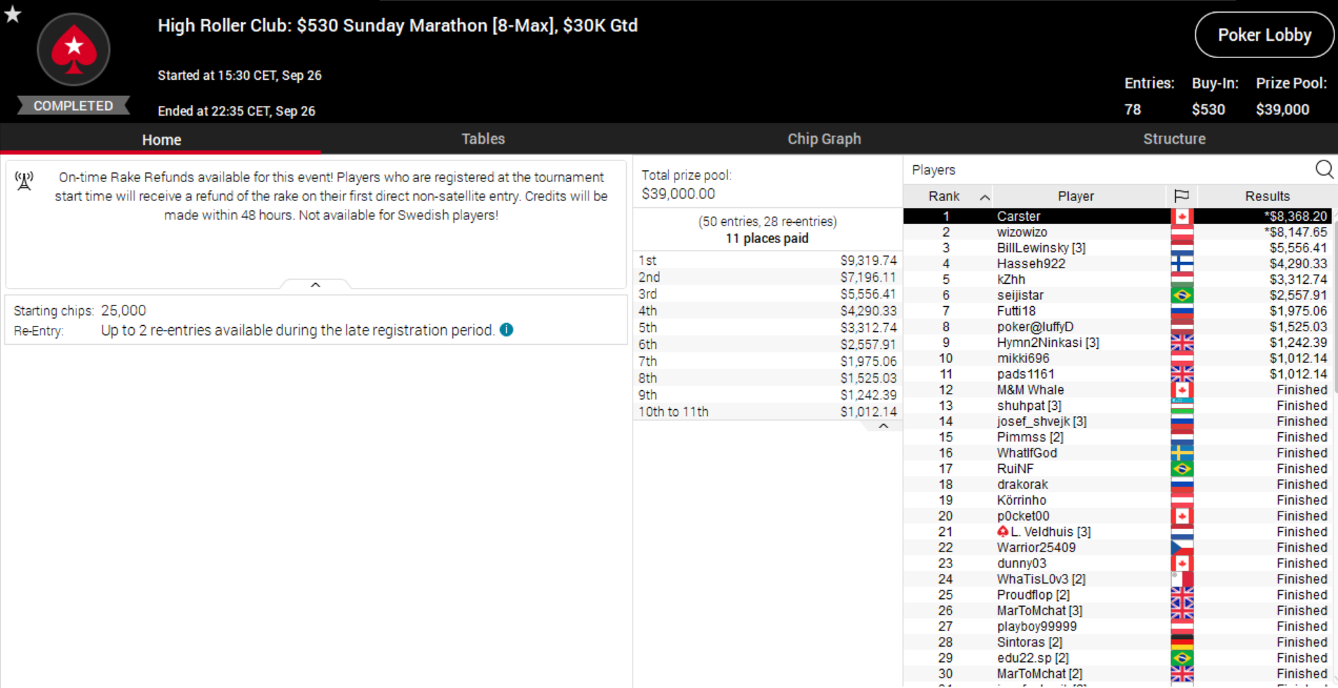 Aus deutschsprachiger Sicht sorgte Ole Schemion für das beste Ergebnis. Beim $530 Sunday Marathon landete er nach Deal hinter „Carster“ aus Kanada auf Platz 2 und kassierte gut $8.000 Preisgeld.
