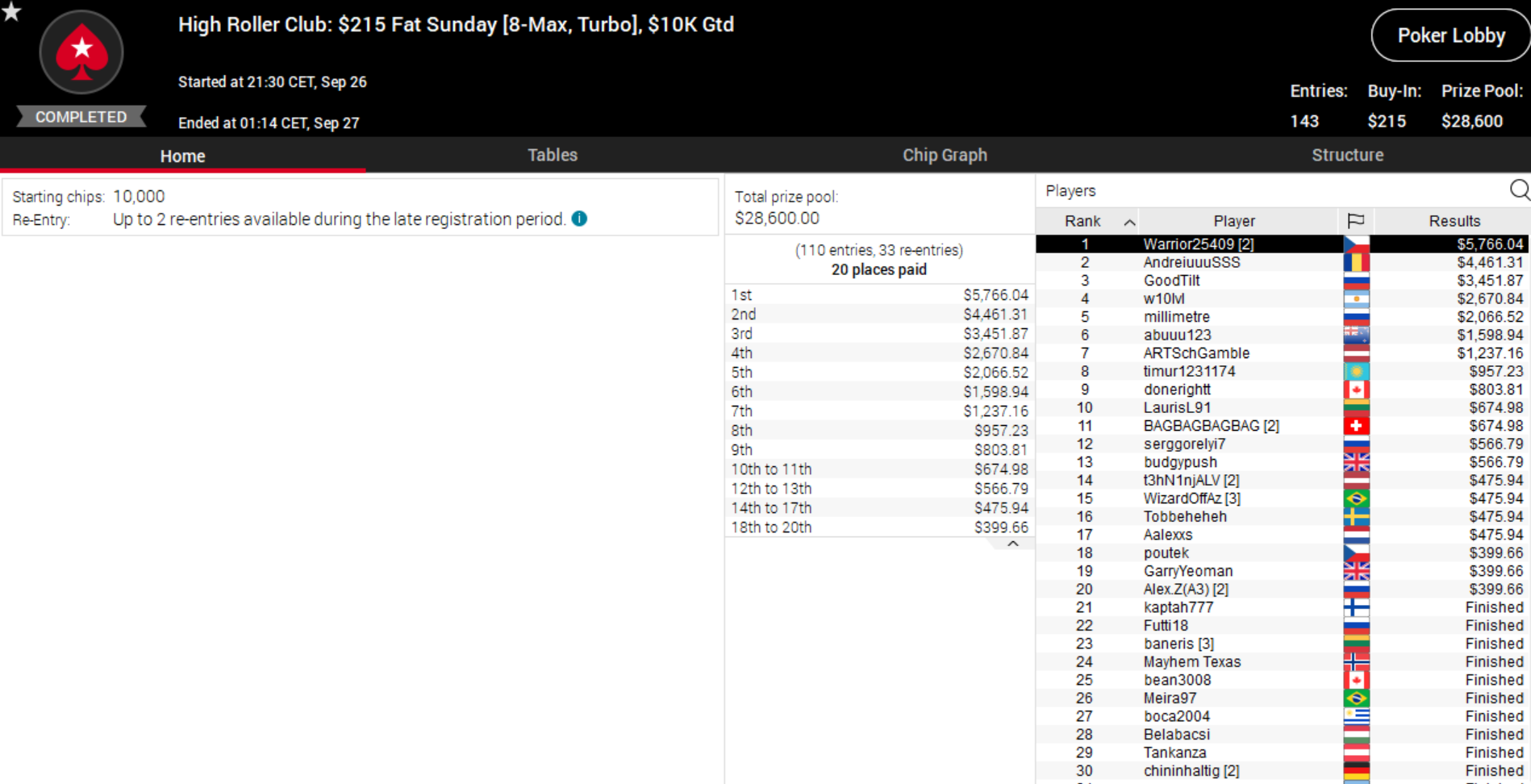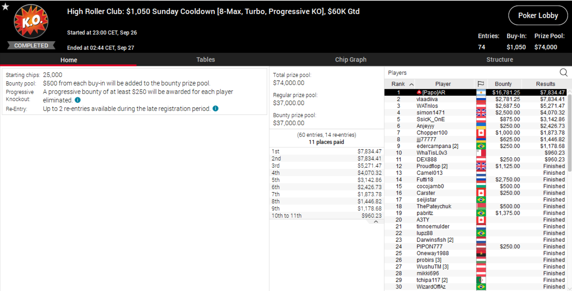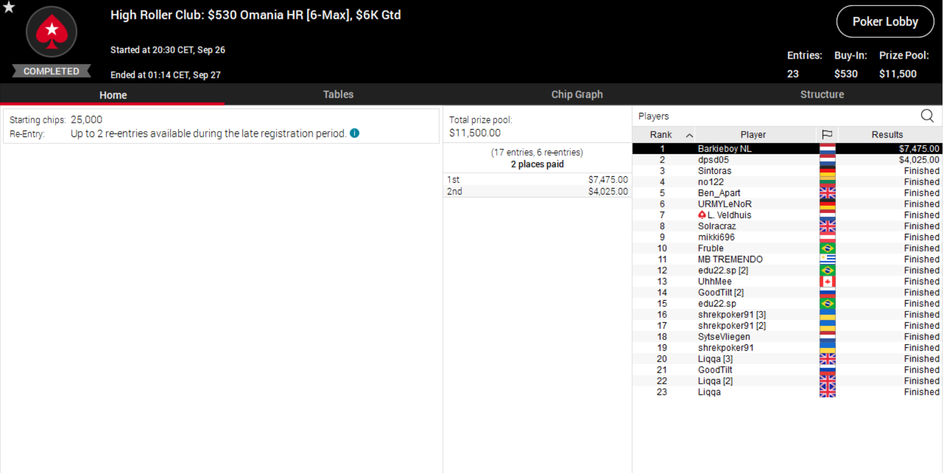 Aus deutschsprachiger Sicht sorgte Ole Schemion für das beste Ergebnis. Beim $530 Sunday Marathon landete er nach Deal hinter „Carster“ aus Kanada auf Platz 2 und kassierte gut $8.000 Preisgeld.