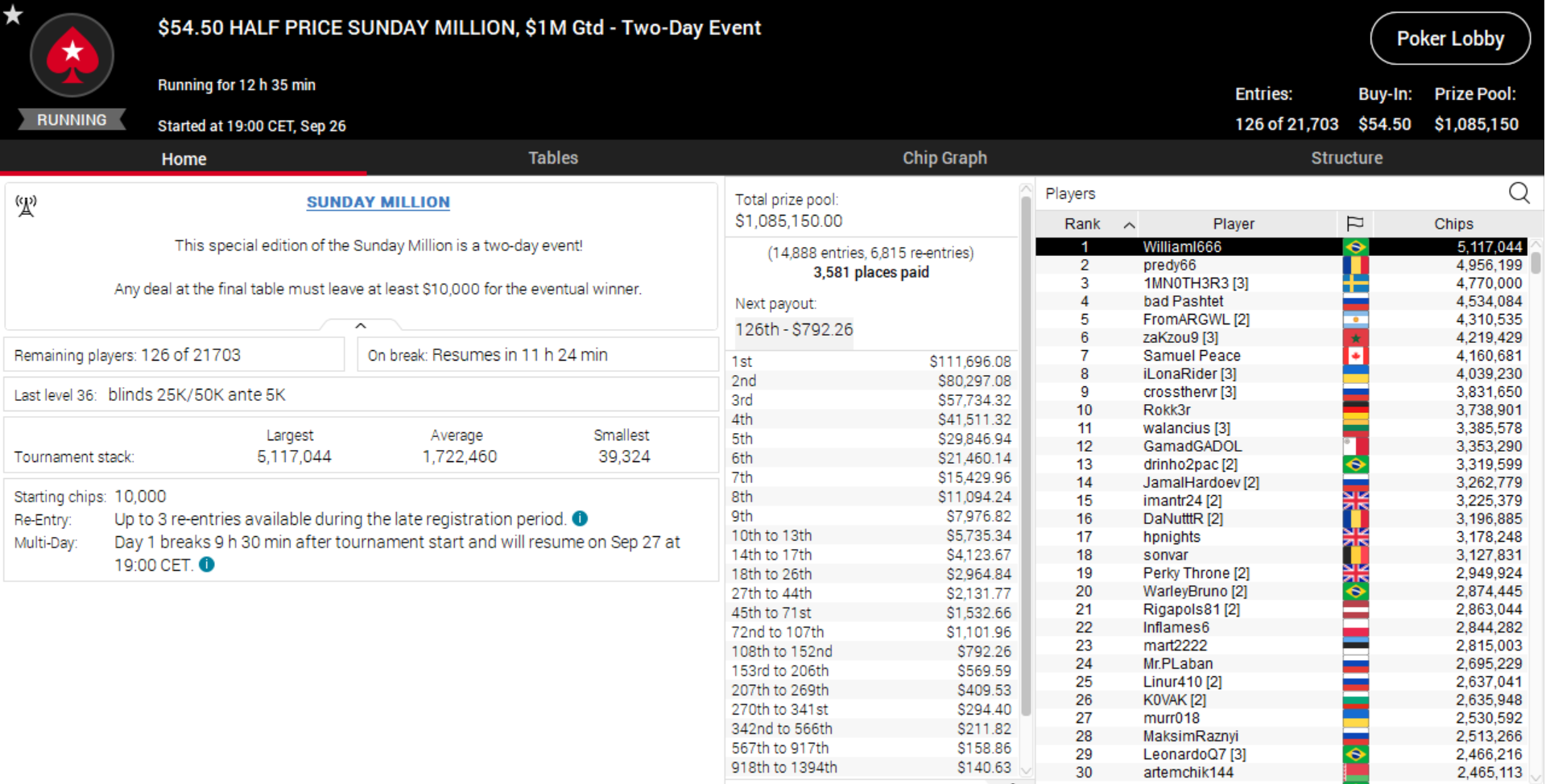 Besonders gespannt war man natürlich auf die Sunday Million, die dieses Mal mit einem halbierten Startgeld von $54,50, aber voller Garantie von $1 Million ausgetragen wurde.