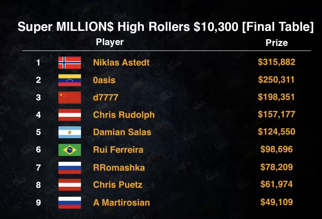 Platz 3 ging nach China an den Unbekannten „d7777“. Im Heads-Up duellierten sich „0asis“ und der Altbekannte Niklas Astedt, der am Ende das Turnier für sich entscheiden konnte. Der Sieg brachte $ 315.882, für den Runner-Up blieben $250.311.