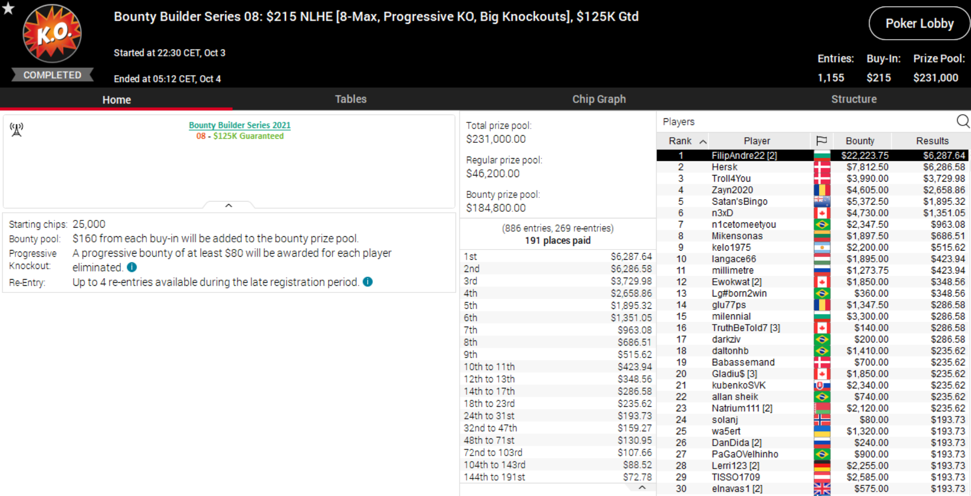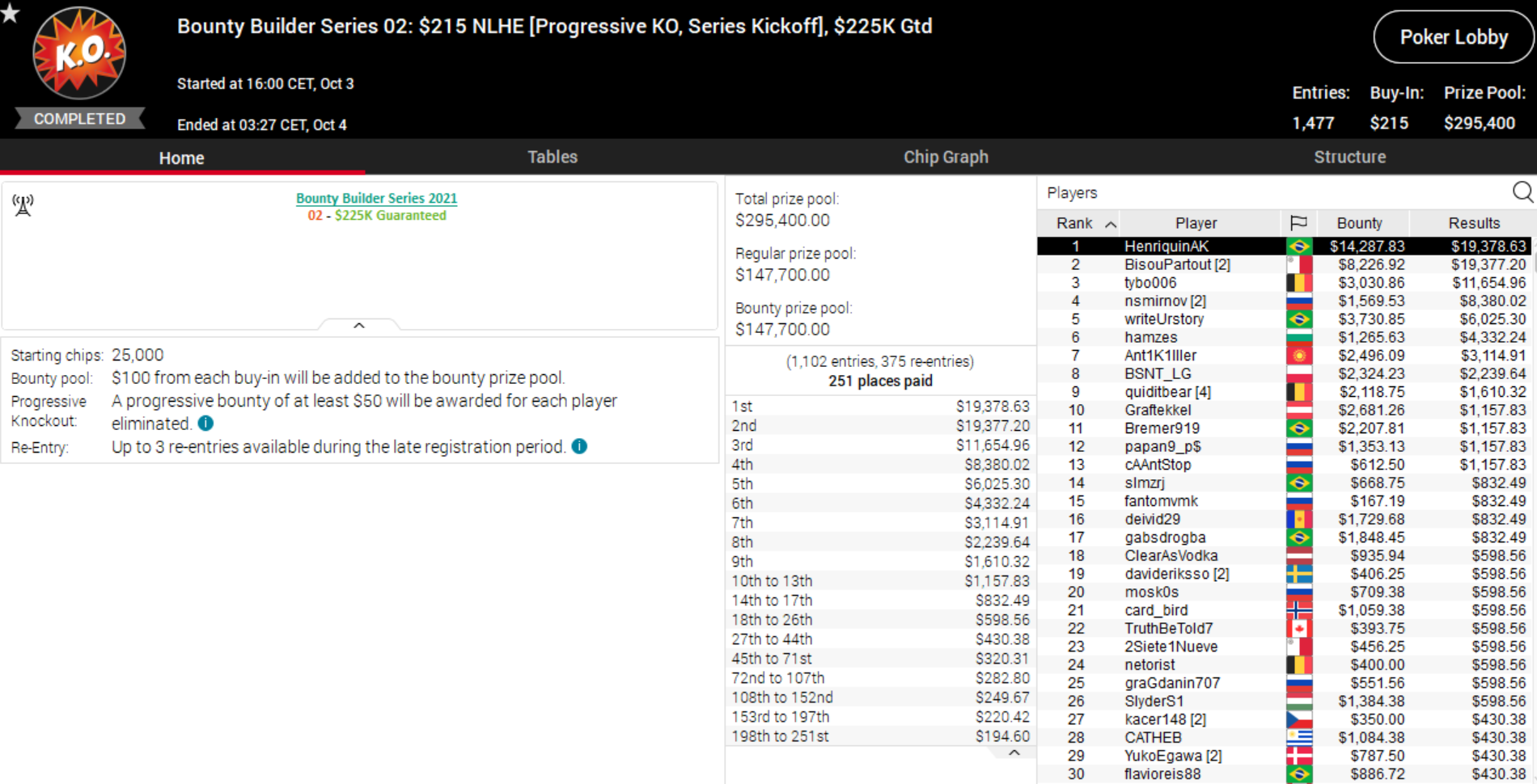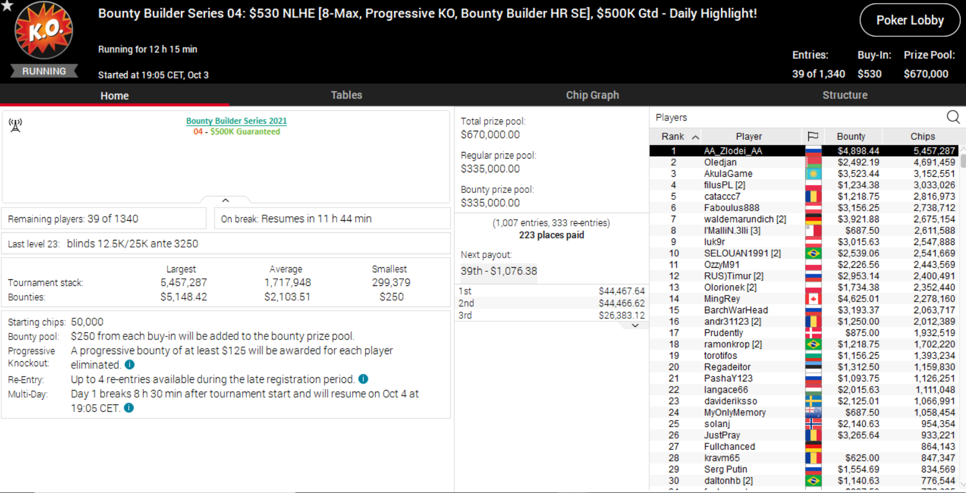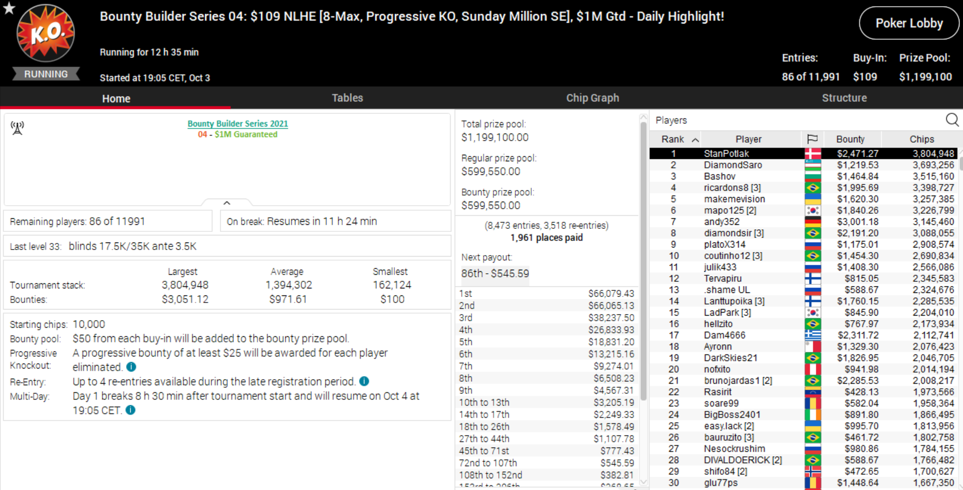 Mit elf Turnieren wurde gestern zudem die Bounty Builder Series gestartet, in deren Rahmen auch die Sunday Million und der „normale“ $530 Bounty Builder ausgetragen wurden.