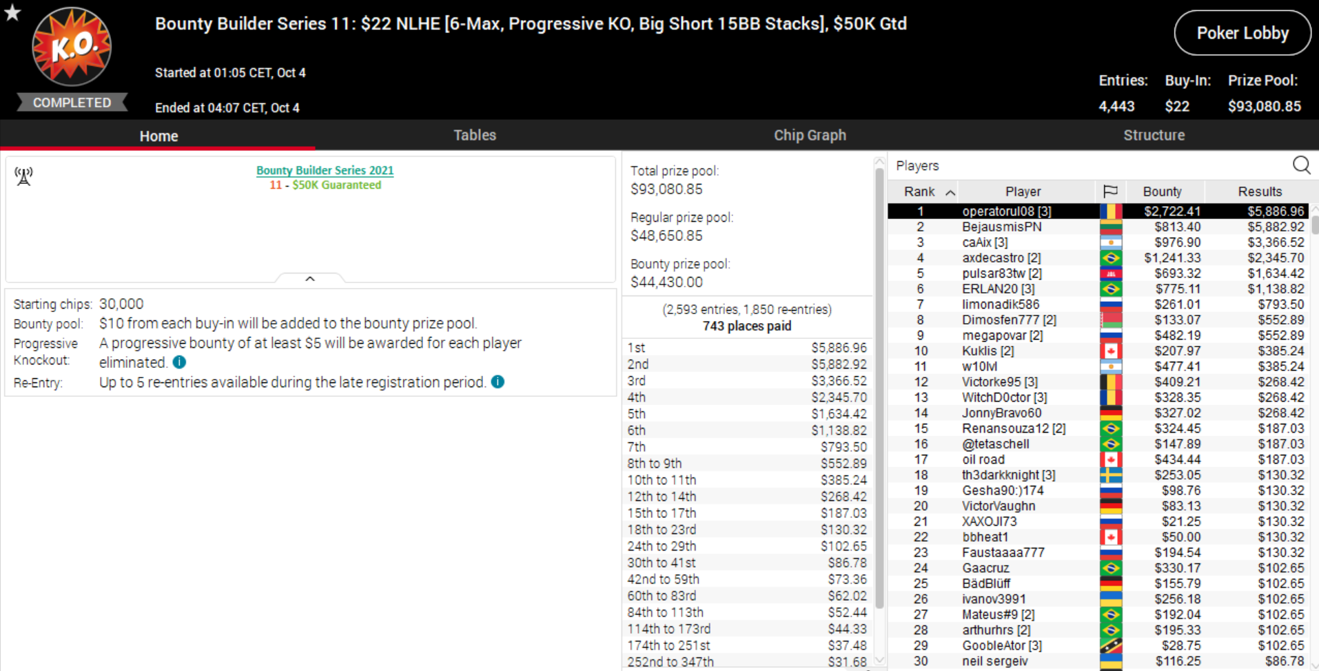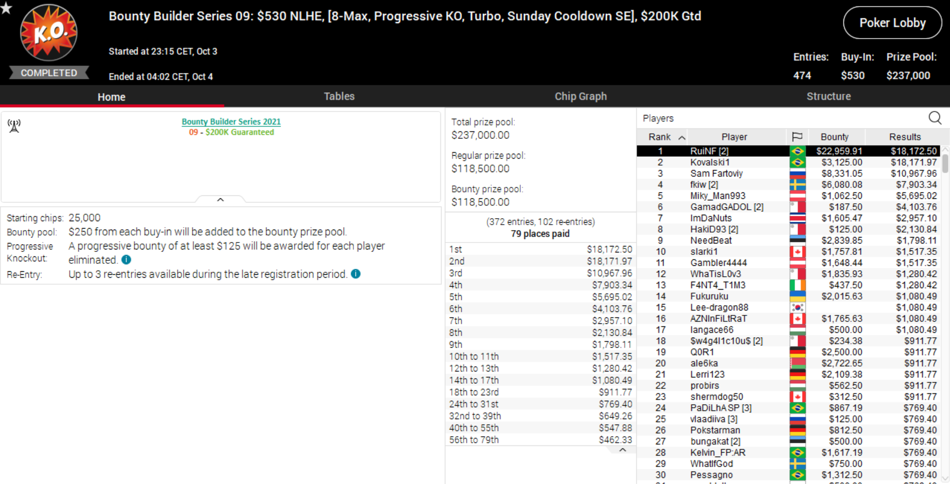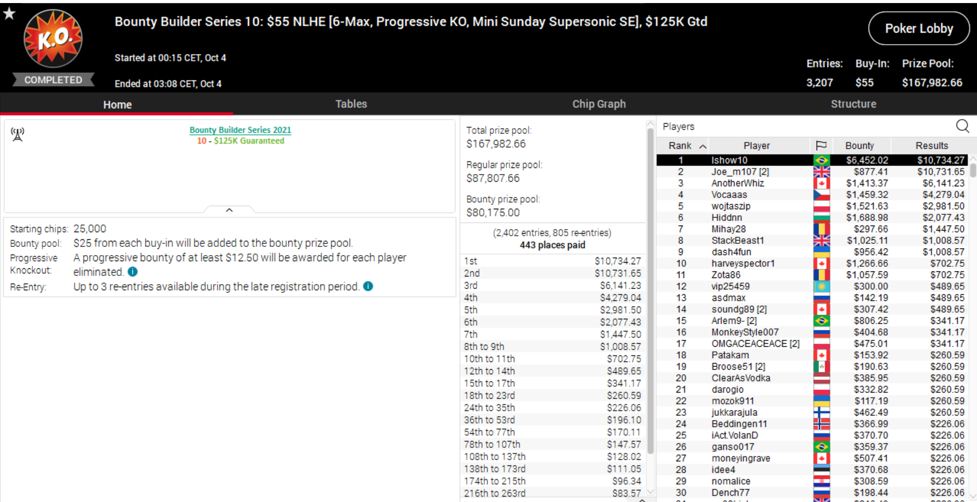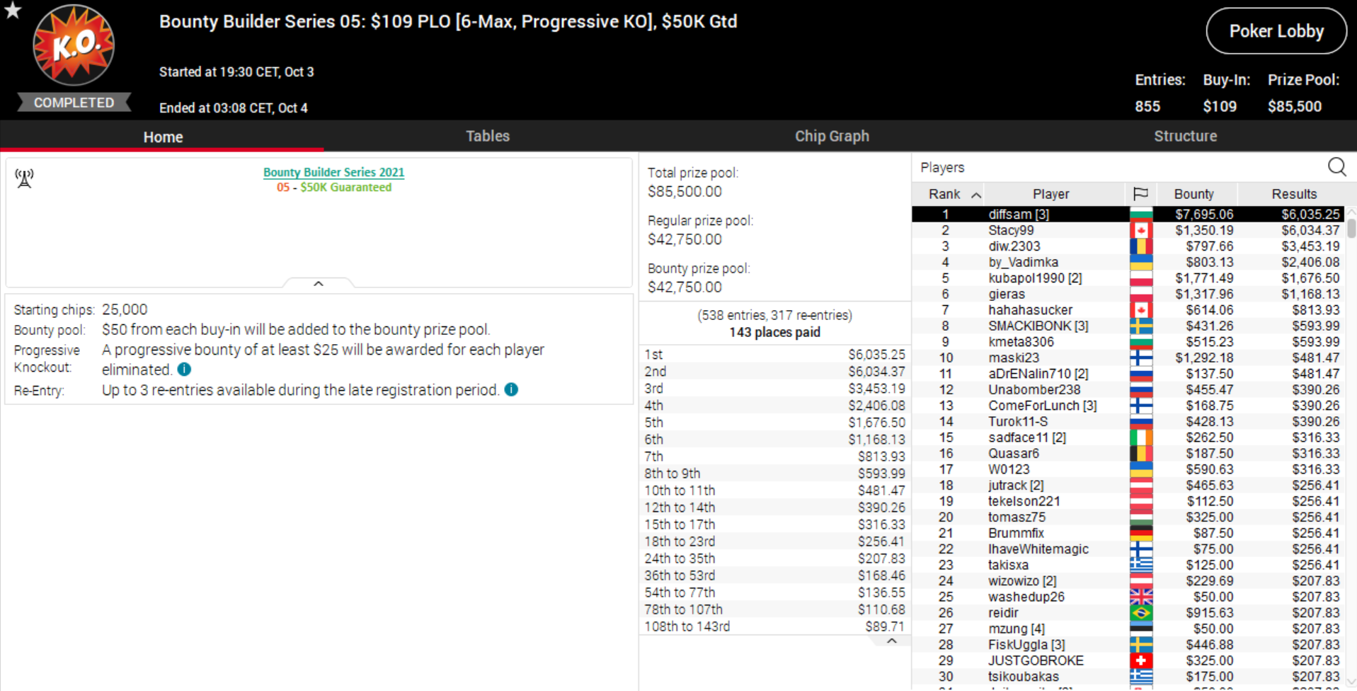 Mit elf Turnieren wurde gestern zudem die Bounty Builder Series gestartet, in deren Rahmen auch die Sunday Million und der „normale“ $530 Bounty Builder ausgetragen wurden.