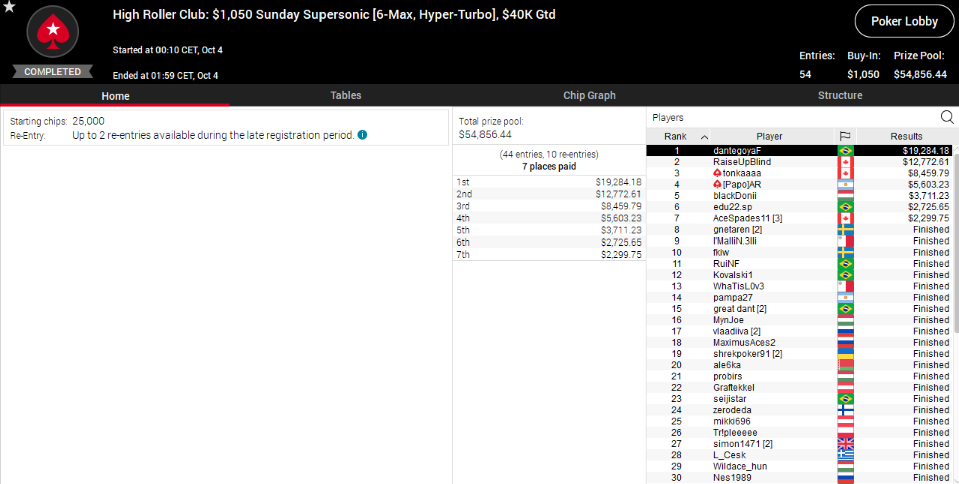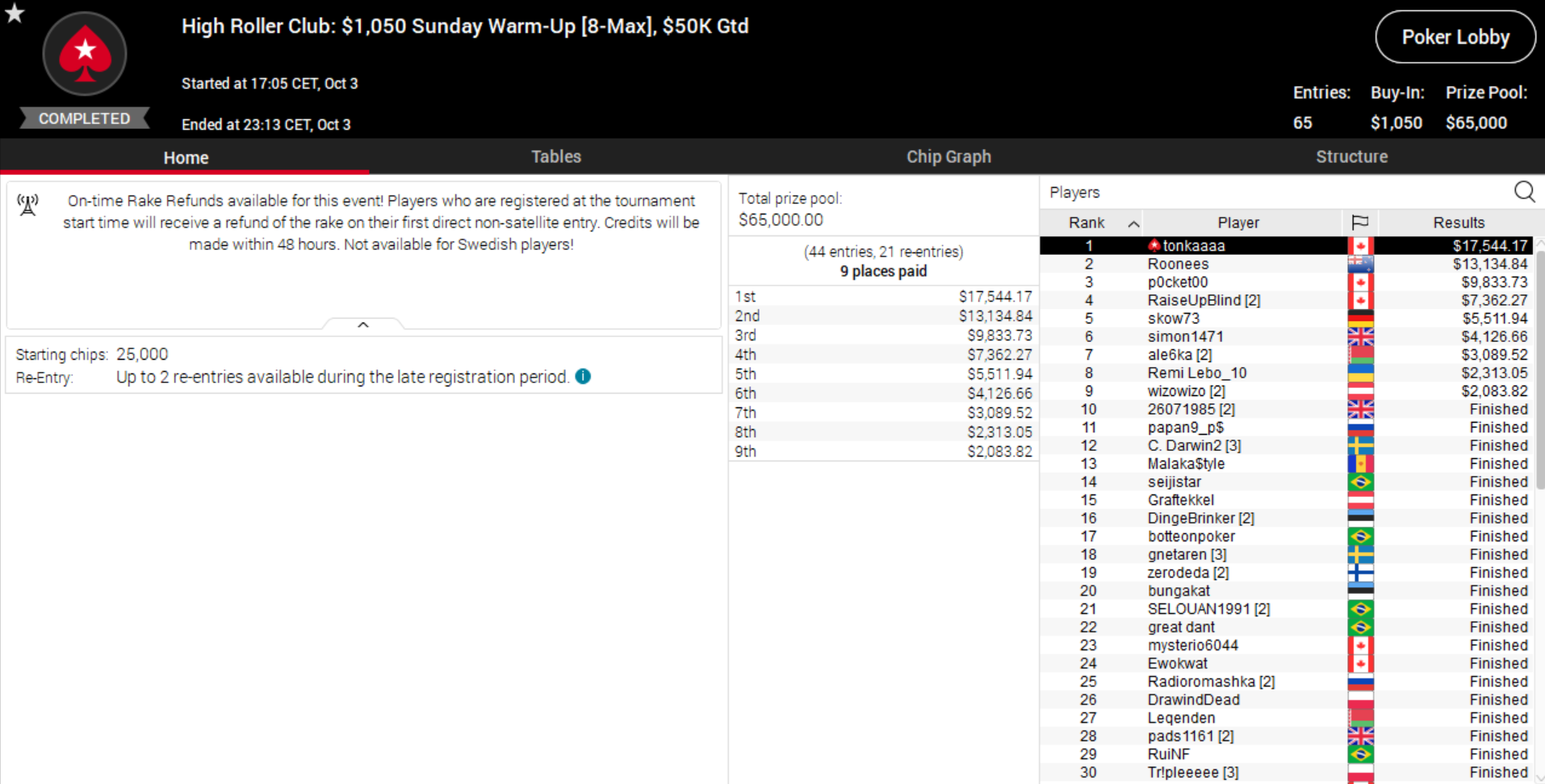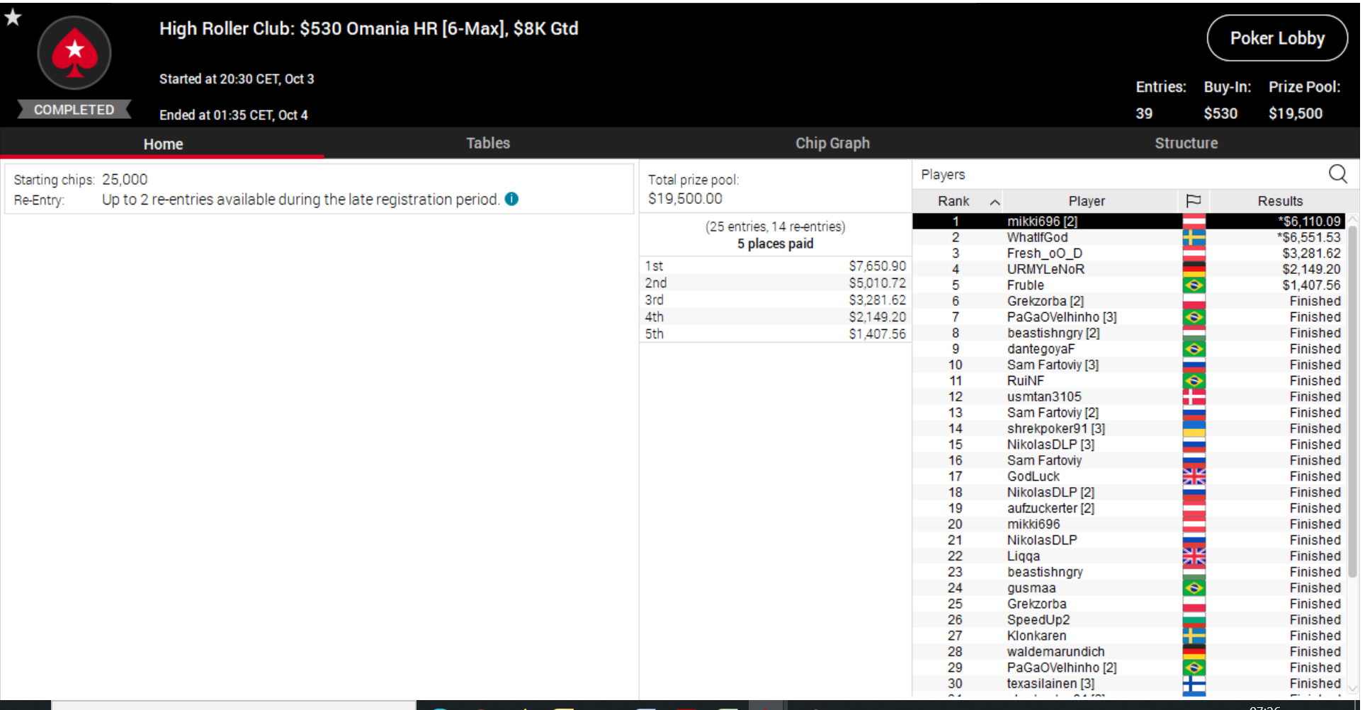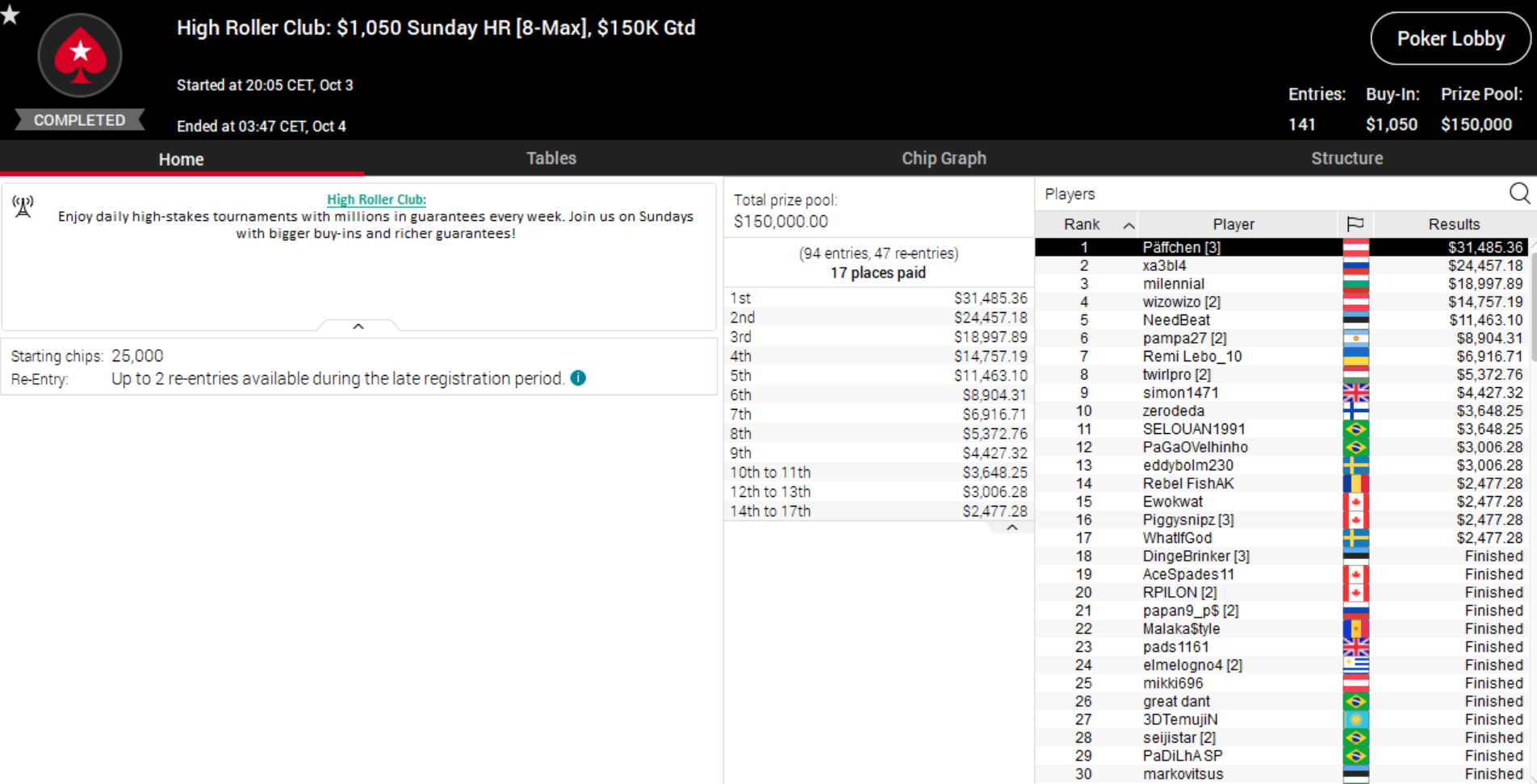 Hier die beiden Ergebnisse und die anderen Resultate des High Roller Clubs: