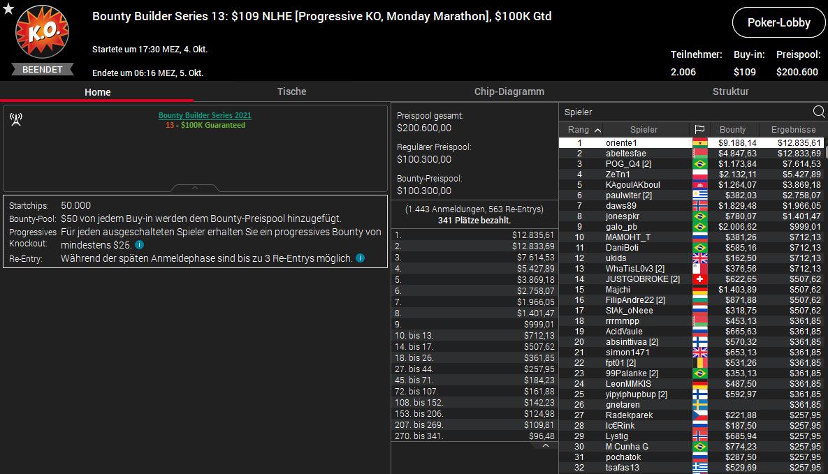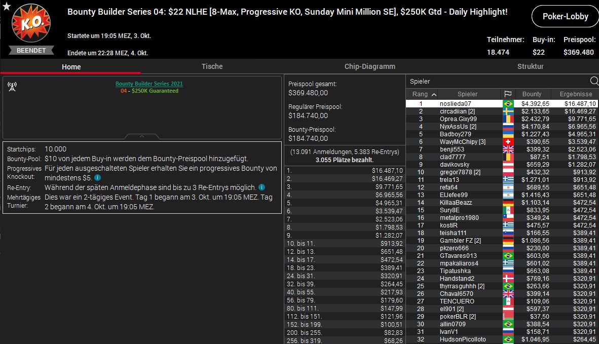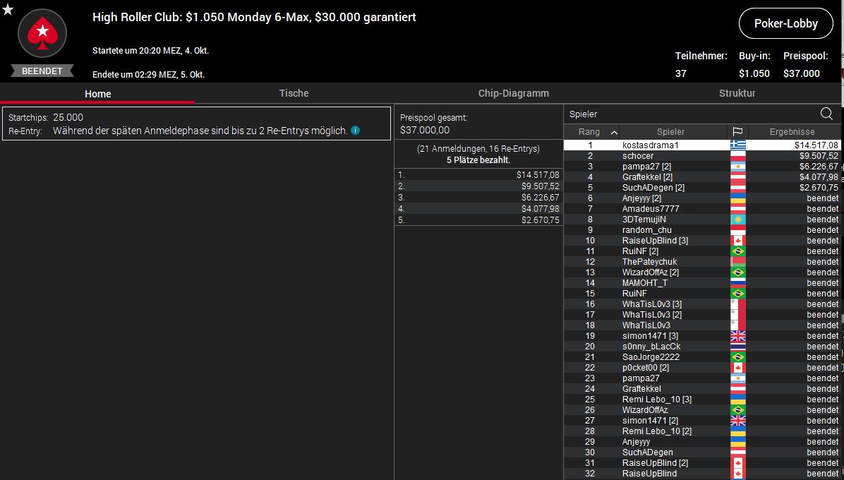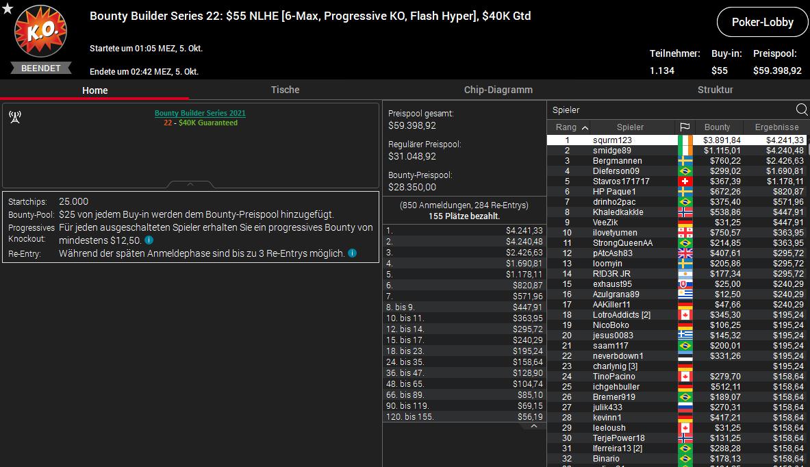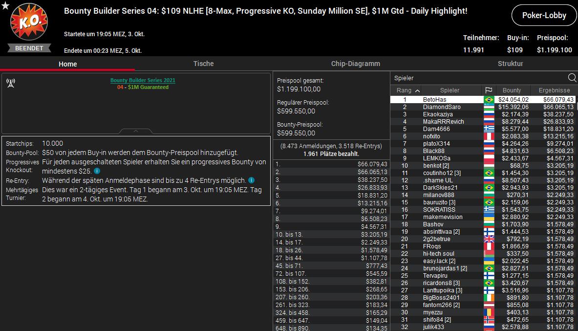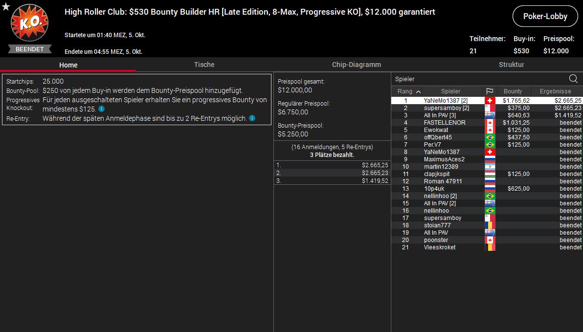 Das $530 Bounty Builder HR SE gewann der Schwede davideriksso ($44.467/$32.688), Faboulous888 ($1.817/$3.156) aus Österreich und waldemarundich ($1.817/$3.921) aus Deutschland belegten die Plätze 14 und 15.
