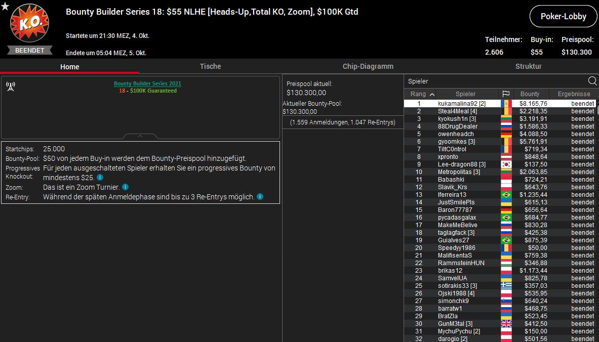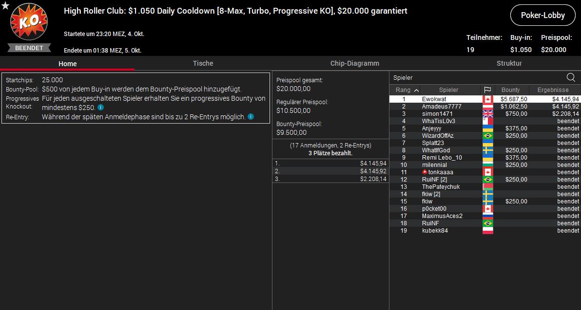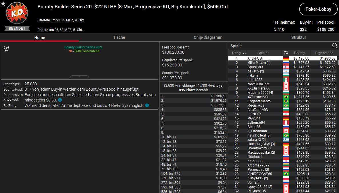 Einen Sieg feierte dagegen AndyFCB aus Deutschland beim $22 NLHE Big Knockouts. Pro Buy-in gingen $17 in den Knockout-Preispool, sodass AndyFCB zwar nur $1.980 Prämie kassierte, dafür aber satte $8.196 in Form von Bounties.