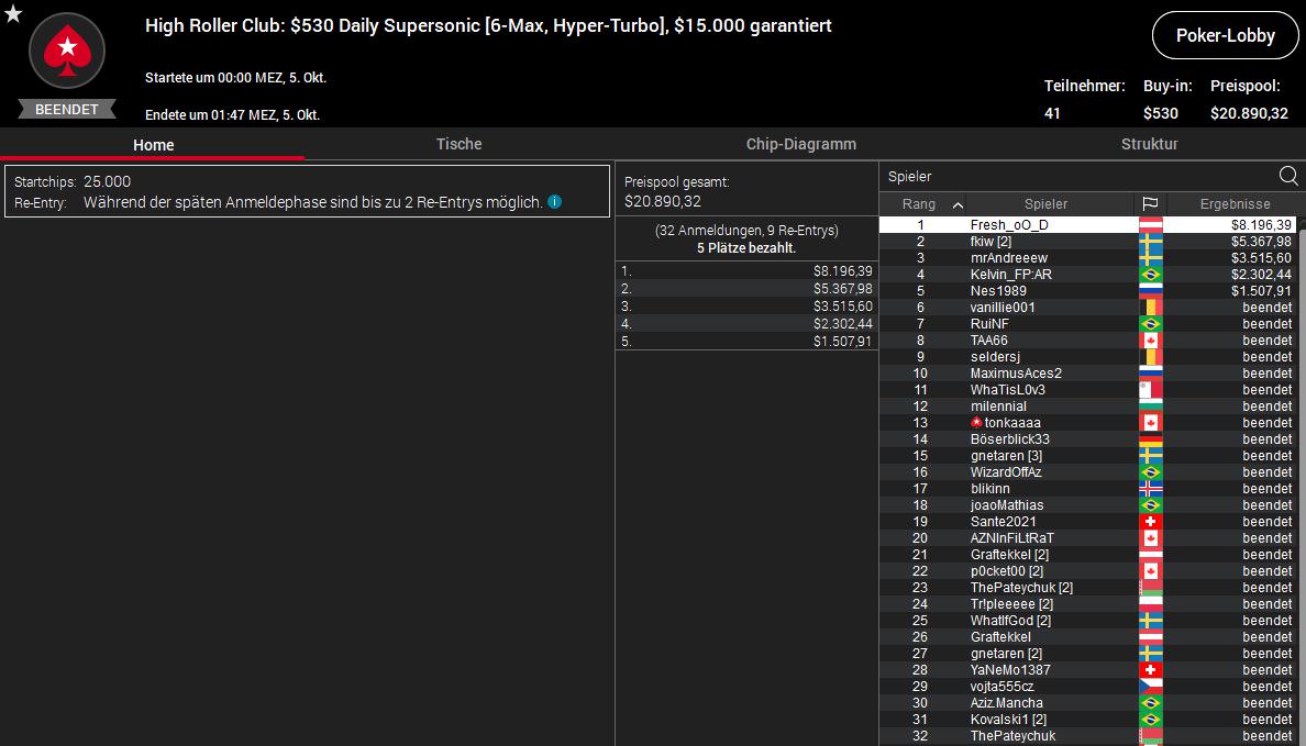 Im High Roller Club feierte Jens Fresh_oO_D Lakemeier den Sieg für $8.196 beim $530 Daily Supersonic. Der Schweizer YaNeMo1387 gewann das $530 Bounty Builder HR Late Edition für $2.665 plus $1.765.