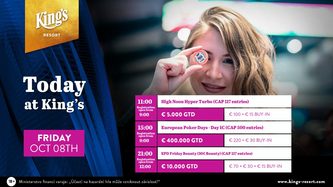 Heute geht es im King’s mit dem High Noon Hyper Turbo um 11 Uhr weiter. Um 15 Uhr folgt dann Tag 1C der European Poker Days, ehe um 21 Uhr noch das EPD Friday Bounty für €115 auf dem Programm steht.