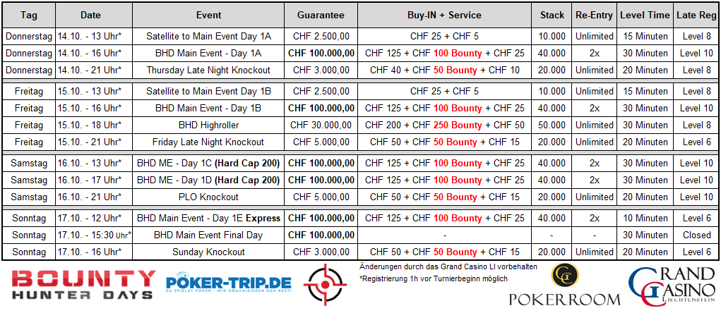 Der Countdown läuft! Im Grand Casino Liechtenstein beginnen am Donnerstag, dem 14. Oktober, die Bounty Hunter Days powered by Poker-Trip.de.