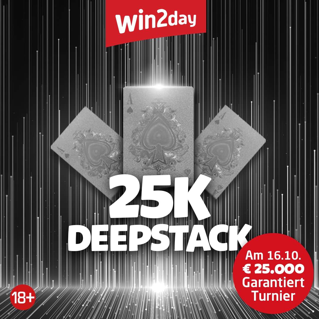 Beim österreichischen Online-Pokerroom „win2day“ steht am Samstag den 16. Oktober 2021 das 25k Deepstack Event mit €25.000 garantiert auf dem Programm.